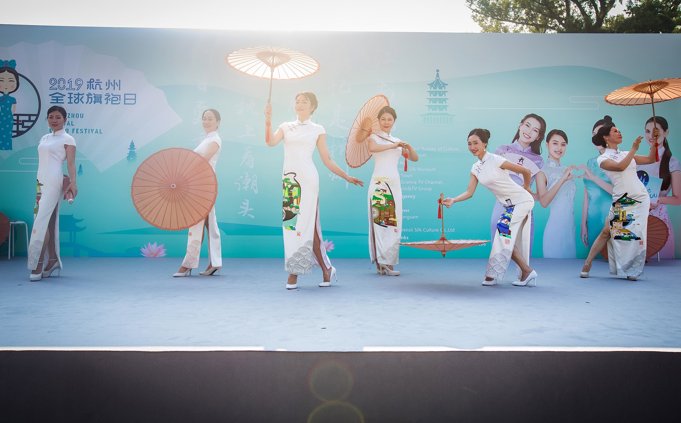 当日,“锦绣杭州·全球共舞”——2019杭州全球旗袍日活动在奥地利维也纳多瑙河公园前举行,中奥两地的模特们穿着不同主题的中式旗袍,向当地观众展示中国传统文化。