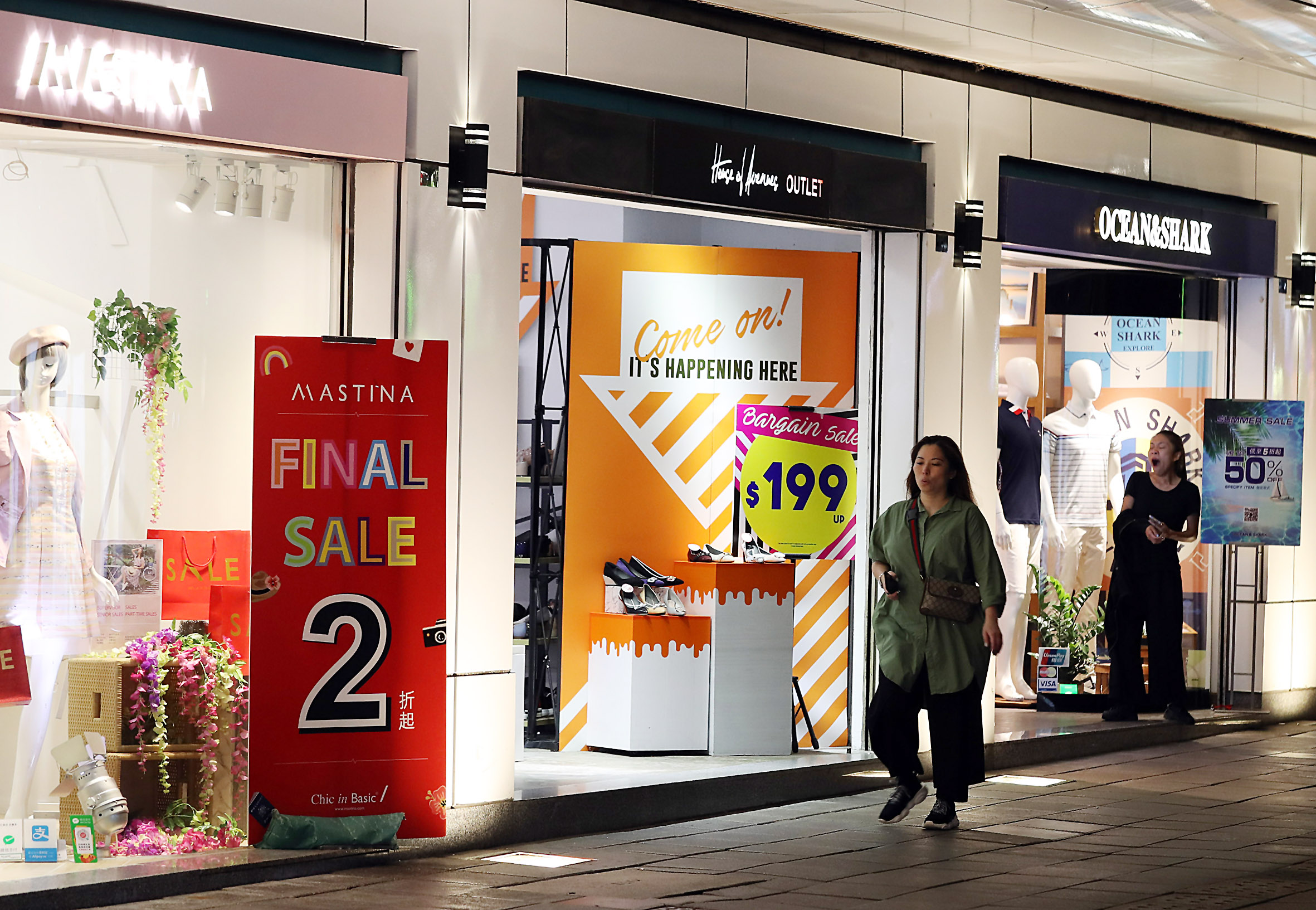 香港尖沙咀附近的商店张贴打折信息以吸引顾客(8月23日摄)。