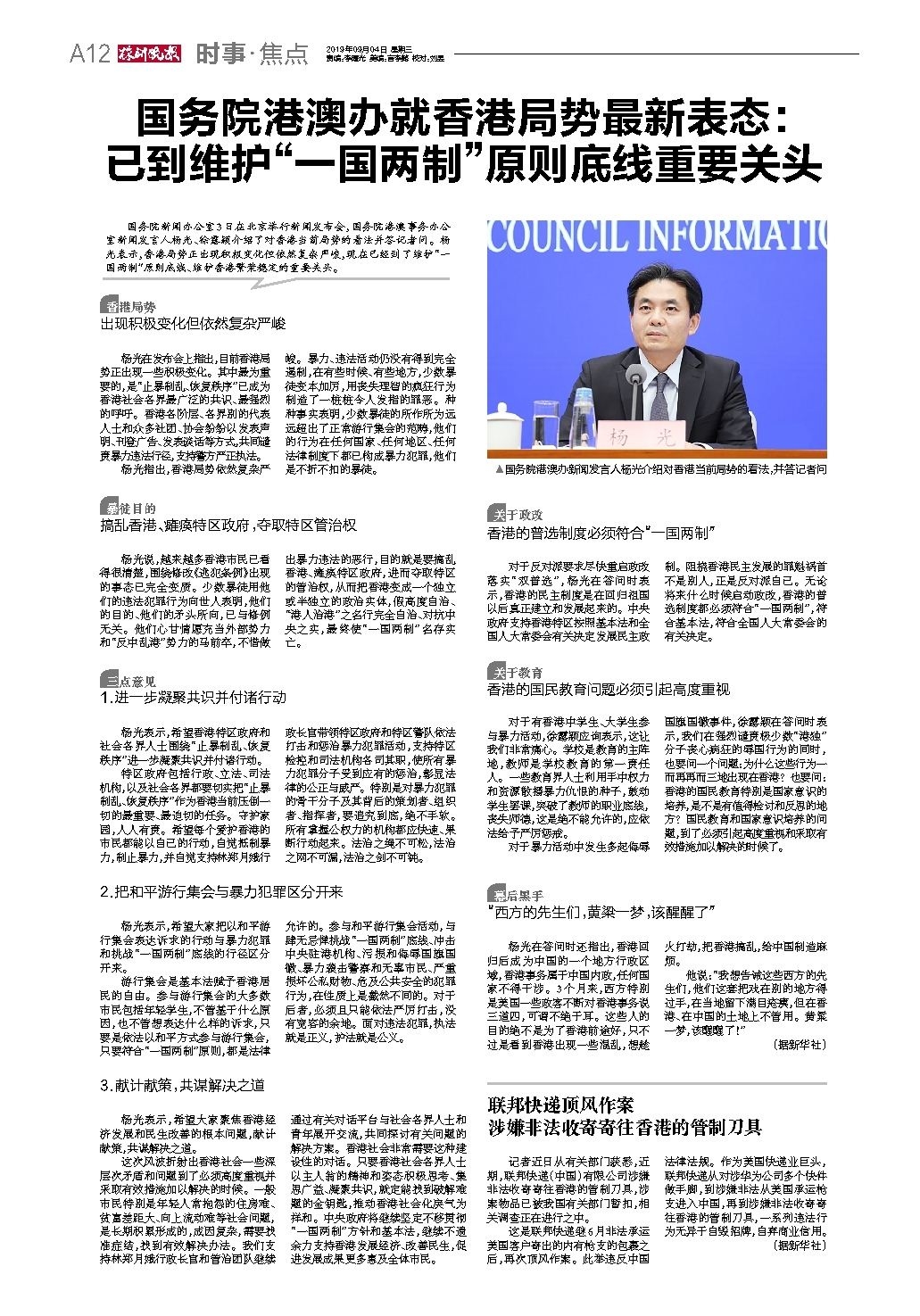 国务院港澳办就香港局势最新表态: 已到维护“一国两制”原则底线重要关头