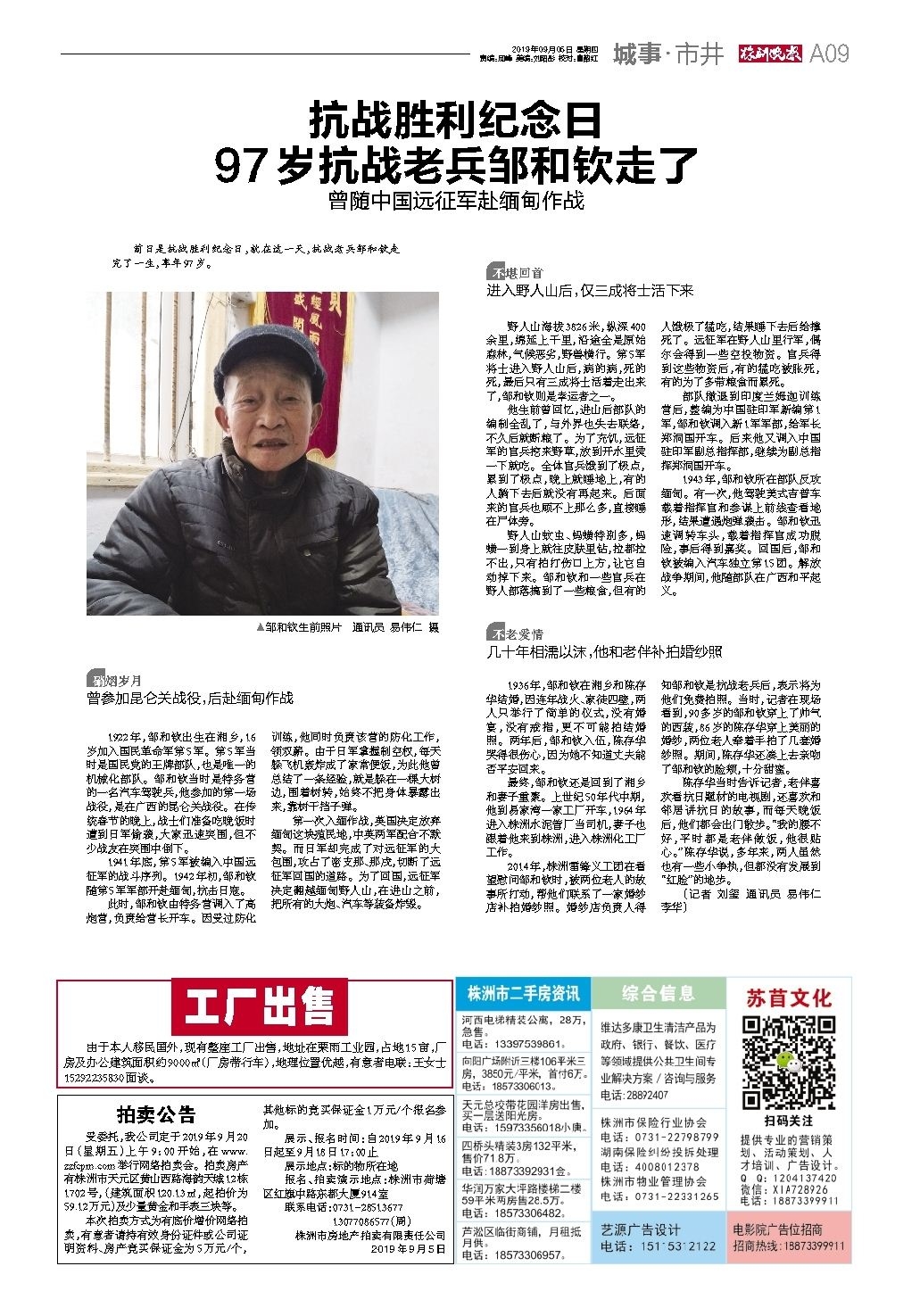 抗战胜利纪念日 97岁抗战老兵邹和钦走了