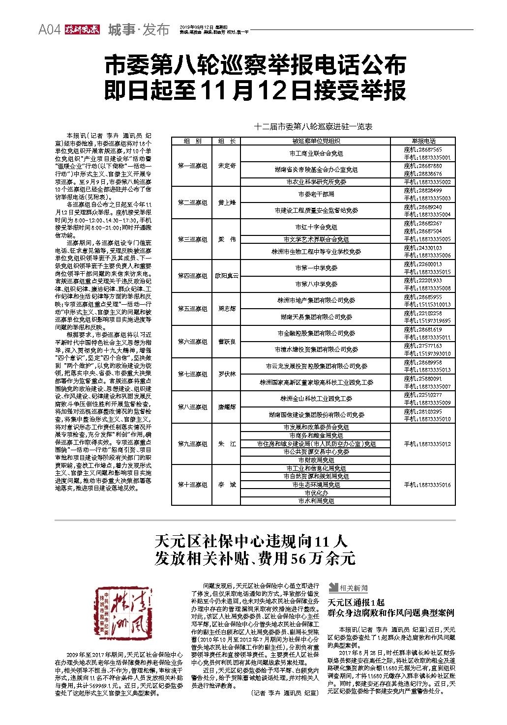 市委第八轮巡察举报电话公布即日起至11月12日接受举报