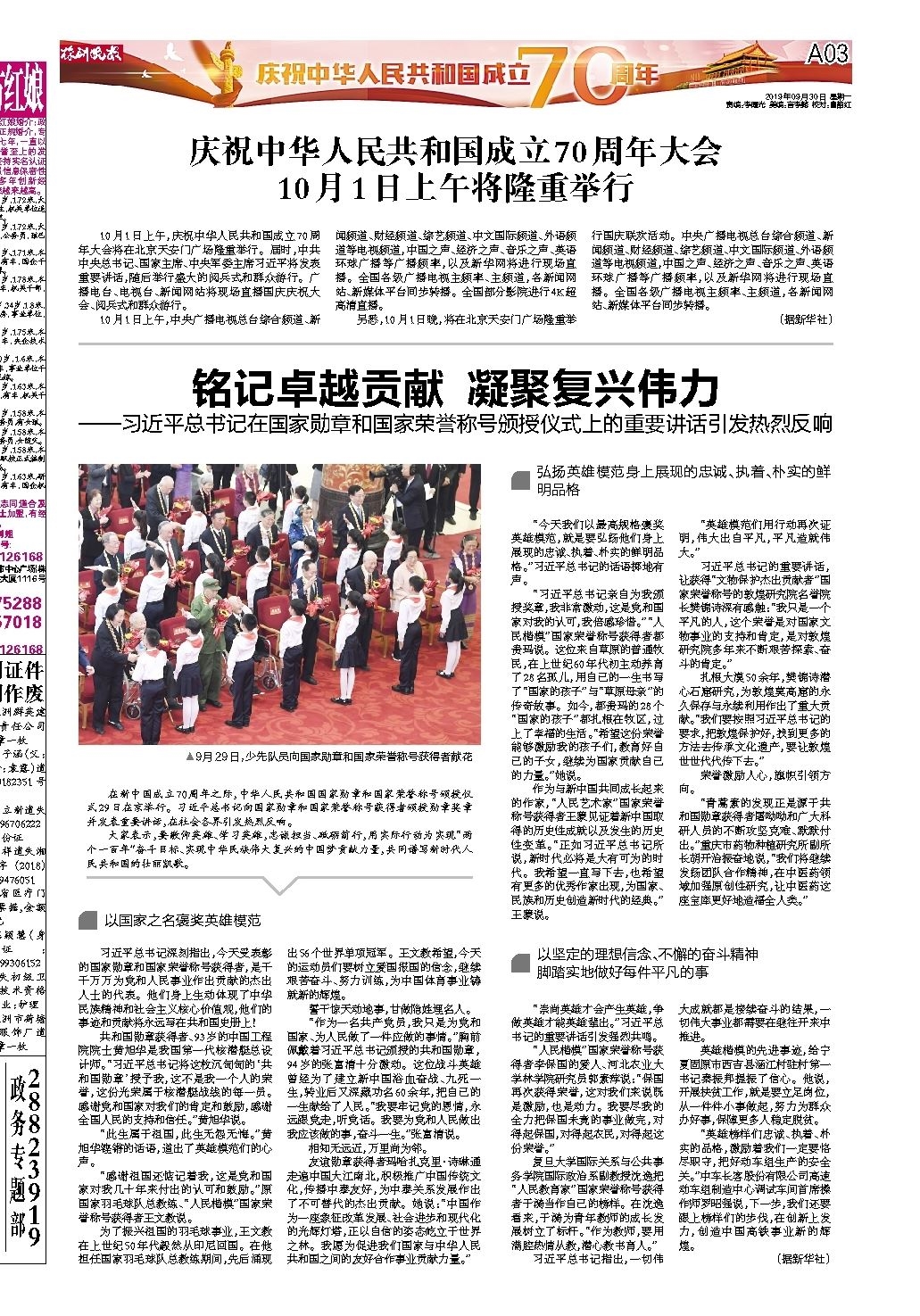 庆祝中华人民共和国成立70周年大会 10月1日上午将隆重举行