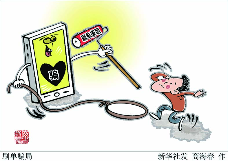 刷单骗局 “足不出户、日入斗金”“点点鼠标、轻松赚钱”……类似的刷单兼职广告你是不是也经常收到?近两年来,越来越多想赚钱的年轻人选择网络刷单作为兼职,谁知挣钱不成,很多人反而一步步走进骗子的圈套。警方提醒,当下绝大多数网络兼职刷单都是诈骗,广大网友一定要提高警惕,小心被“套路”。 (据新华社)