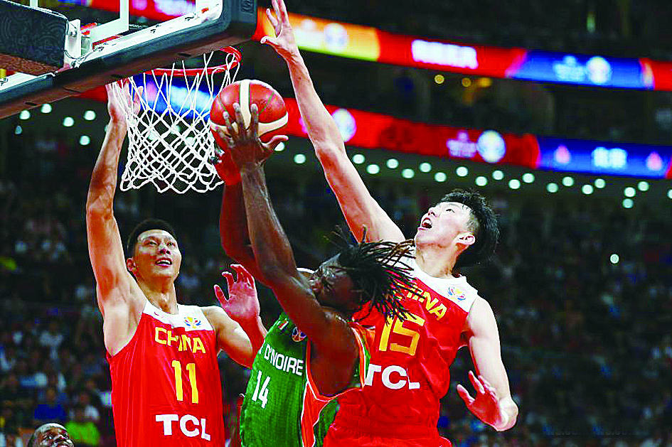 ▲8月31日,中国球员周琦(右)在比赛中封盖。当日,中国队以70:55战胜科特迪瓦队