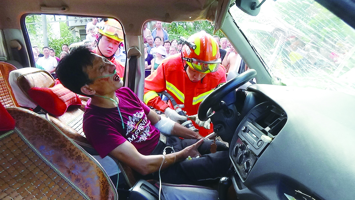 前日下午,渌口区龙门镇,两辆小货车发生相撞,其中一名男司机的脚被变形的驾驶室部件卡住,无法动弹。随后,当地消防部门用工具对车辆实施破拆,司机被成功救出。由于救援及时,他没有生命危险。