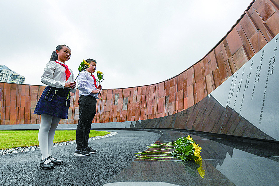 9月3日,小学生代表在侵华日军南京大屠杀遇难同胞纪念馆的胜利广场献花。