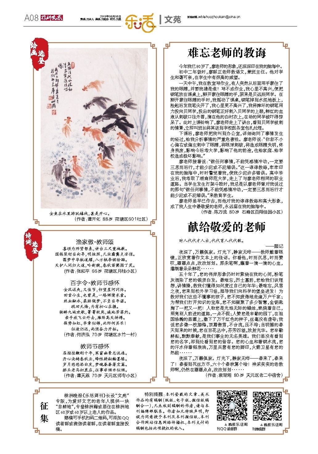 株洲晚报《乐活周刊》长设“文苑”专版,为爱好文艺的老年人提供一块“自耕地”,专登株洲籍或居住在株洲地区60岁或60岁以上老人的作品。