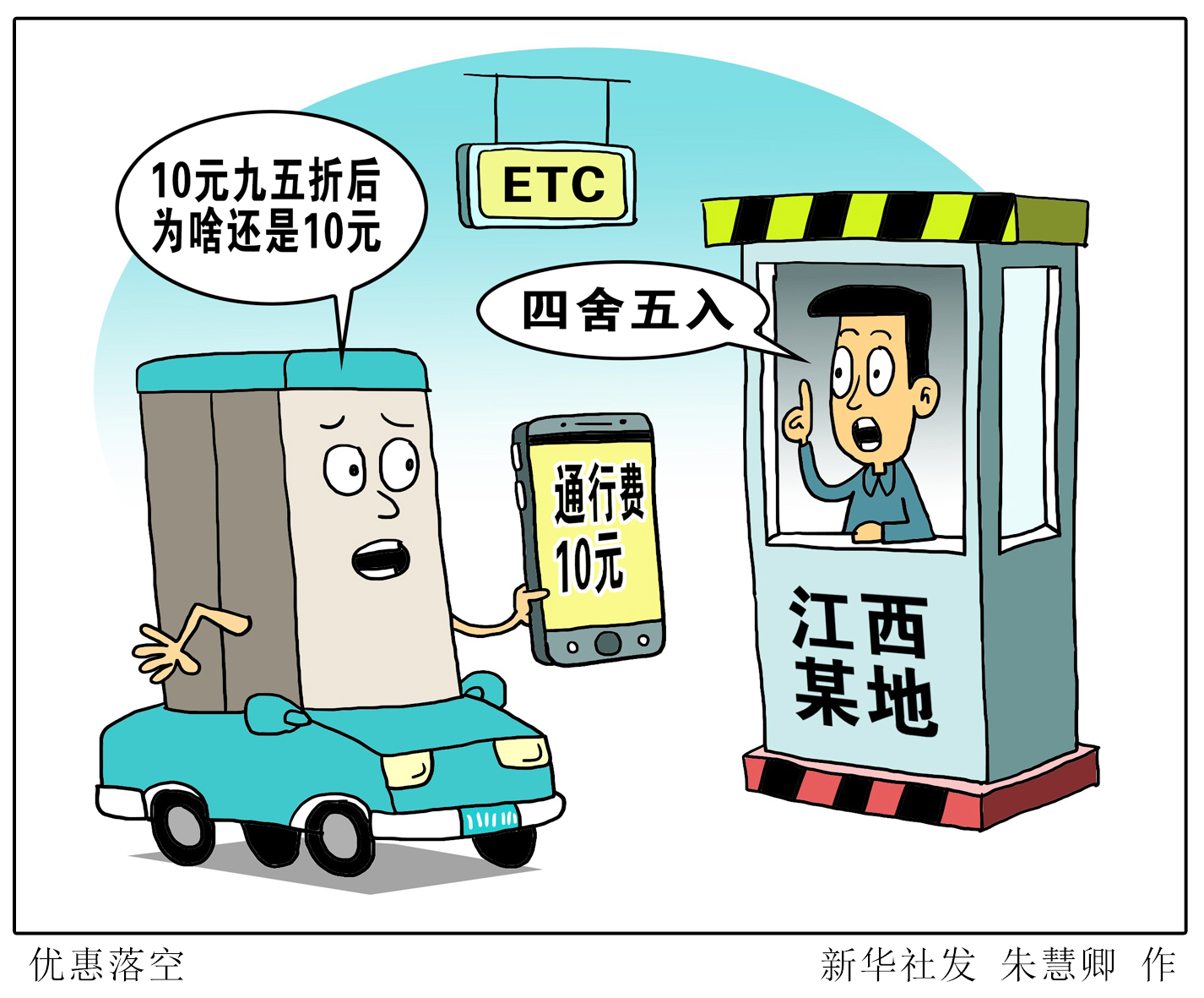 优惠落空 为积极推动ETC安装使用,为取消高速公路省界收费站创造条件,交通运输部今年5月印发《关于大力推动高速公路ETC发展应用工作的通知》,明确要求自2019年7月1日起,严格落实对ETC用户不少于5%的车辆通行费基本优惠政策。但在江西,ETC用户10元通行费打完九五折后又被“四舍五入”成10元。国务院第七督查组日前对这项惠民政策进行了实地督查。 (据新华社)