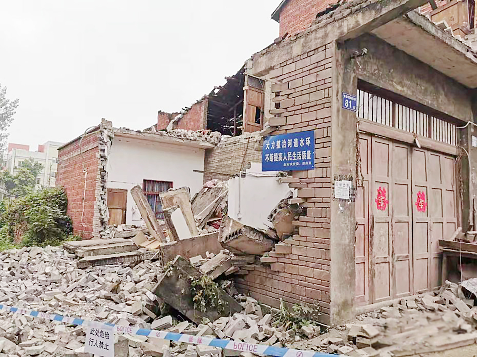 ▲图为在地震中受损垮塌的民房
