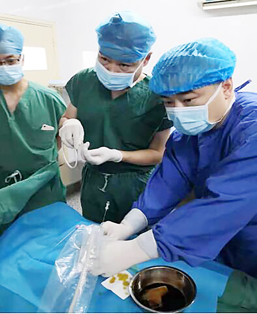 术前,医护人员积极安抚患者,消除患者紧张、恐惧的心理。术中,胡主任凭借多年的经验在患者剑突下精准找到了肝脏病变部位。泌尿外科段主任亲自为患者进行穿刺。在胡主任B超精准引导之下,穿刺成功,没有任何出血,随后,段主任通过输尿管镜、徐主任通过胆道镜,将巨大结石变成了粉碎性结石,从窦道流出。