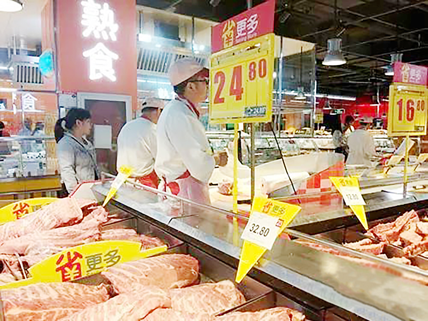 ▲超市里正在售卖猪肉