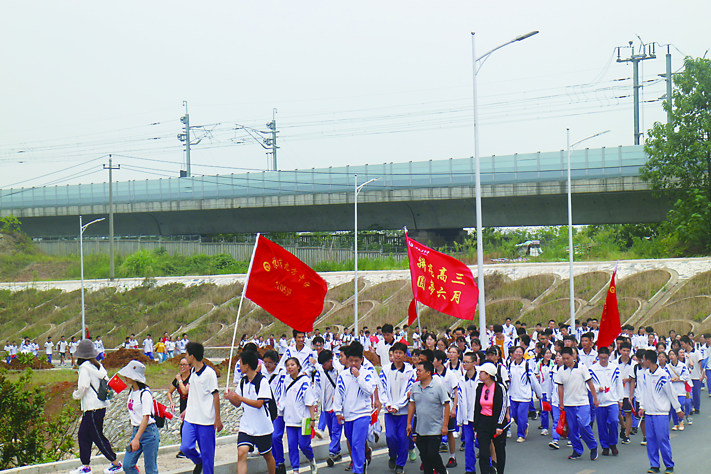 昨日,九方中学300多名高三学生举行了纪念“九一八”励志徒步活动。