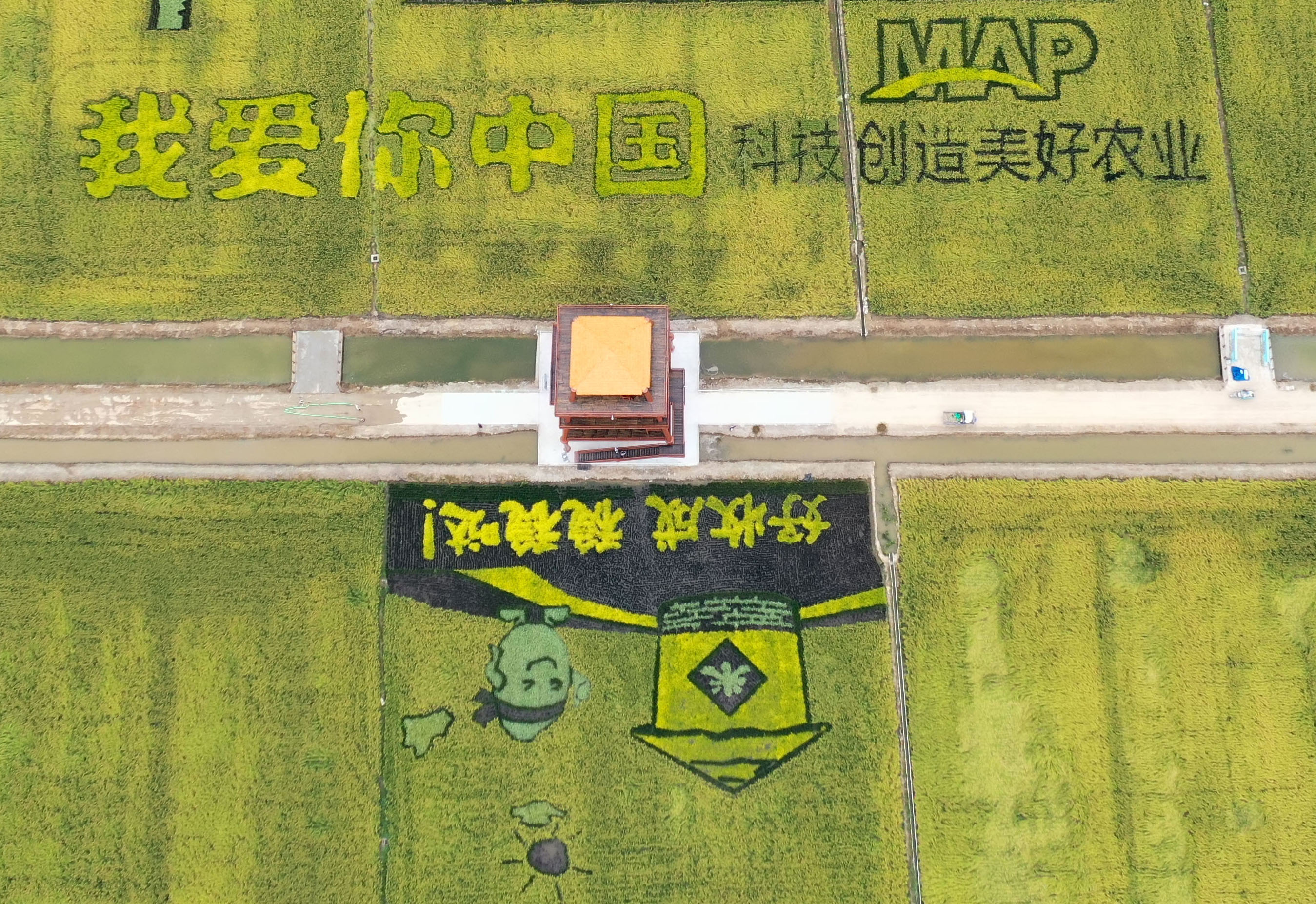 9月19日无人机拍摄的稻田画局部。 近日,位于天津市西青区王稳庄镇中化现代农业MAP示范农场的大型稻田画进入最佳观赏期。据了解,该处稻田画总面积约23亩,中间设置了高约20米的观景台,以方便游客观赏。