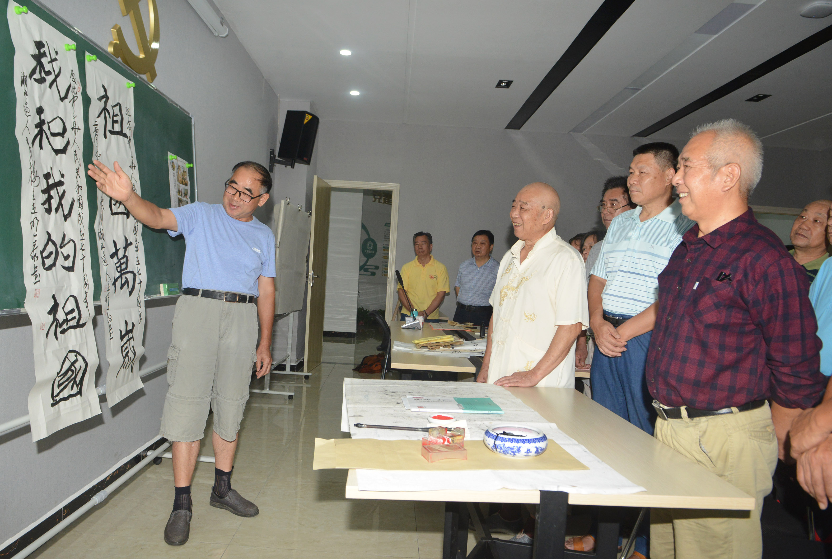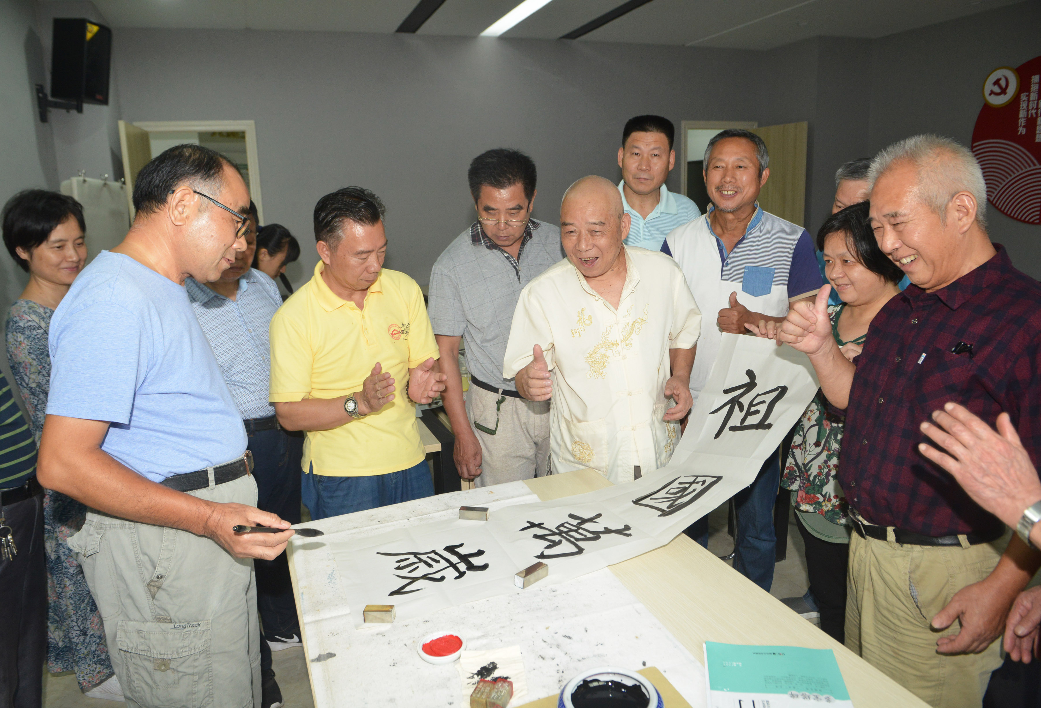 为迎接新中国成立七十周年,9月18日,株洲晚报老年大学进行了一场“我写我的祖国”书法主题活动。身为省书法家协会会员、市硬笔书法家协会名誉主席的书法老师马立明写下带有自己风格的隶书体“我和我的祖国”,让学员们拍手叫好。书写时,马老师详细讲解了笔画与笔画、起笔与落笔之间的书写方法,学员们也积极提出自己的见解与疑问,言语之间,字已完成。