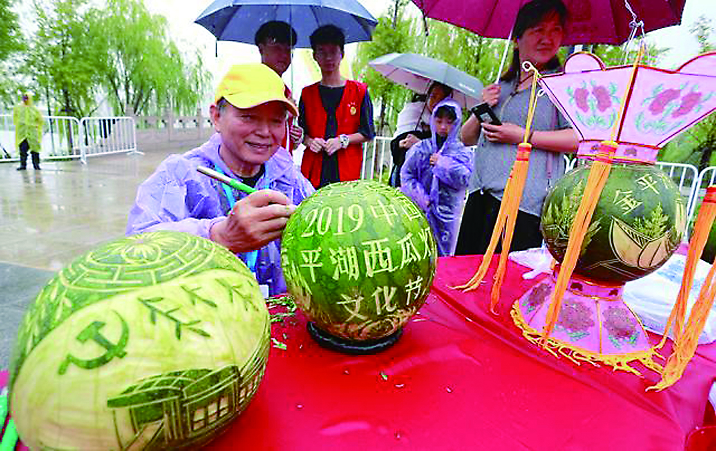 连续举办多年的平湖西瓜灯文化节,于9月19日至23日在浙江平湖举行。文化节以“我和我的祖国”为主题,分为6个展区,共展出西瓜灯730余盏,展现平湖市70年来的城市变迁。图为西瓜灯雕刻艺人正在西瓜上作画。