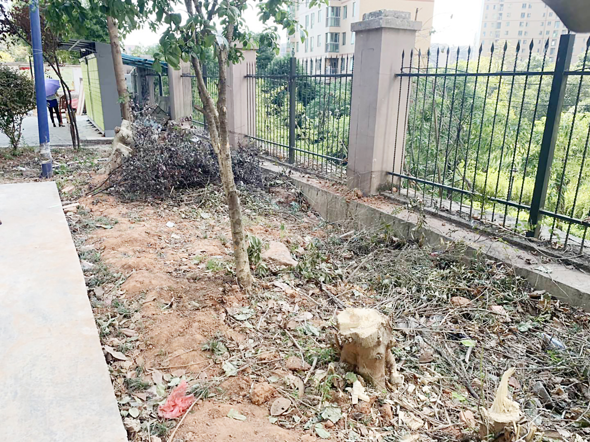 ▲小区公共区域部分树木被砍伐 记者 贺天鸿 摄