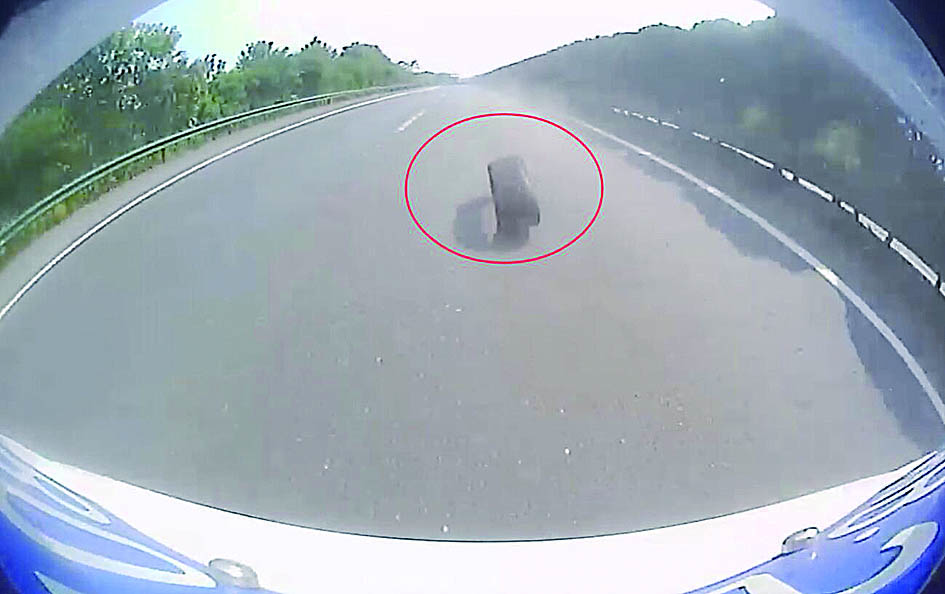 ▲车子爆胎后,胎皮脱落滚走 行车记录仪截图