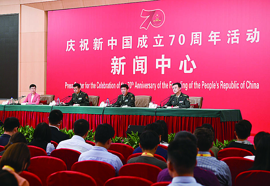 庆祝中华人民共和国成立70周年活动新闻中心24日在京举办第一场专题集体采访。阅兵领导小组办公室副主任、中央军委联合参谋部作战局副局长蔡志军,阅兵联合指挥部办公室常务副主任、中国人民解放军中部战区副参谋长谭民,国防部新闻局局长、国防部新闻发言人吴谦介绍有关阅兵活动安排,并回答记者提问。
