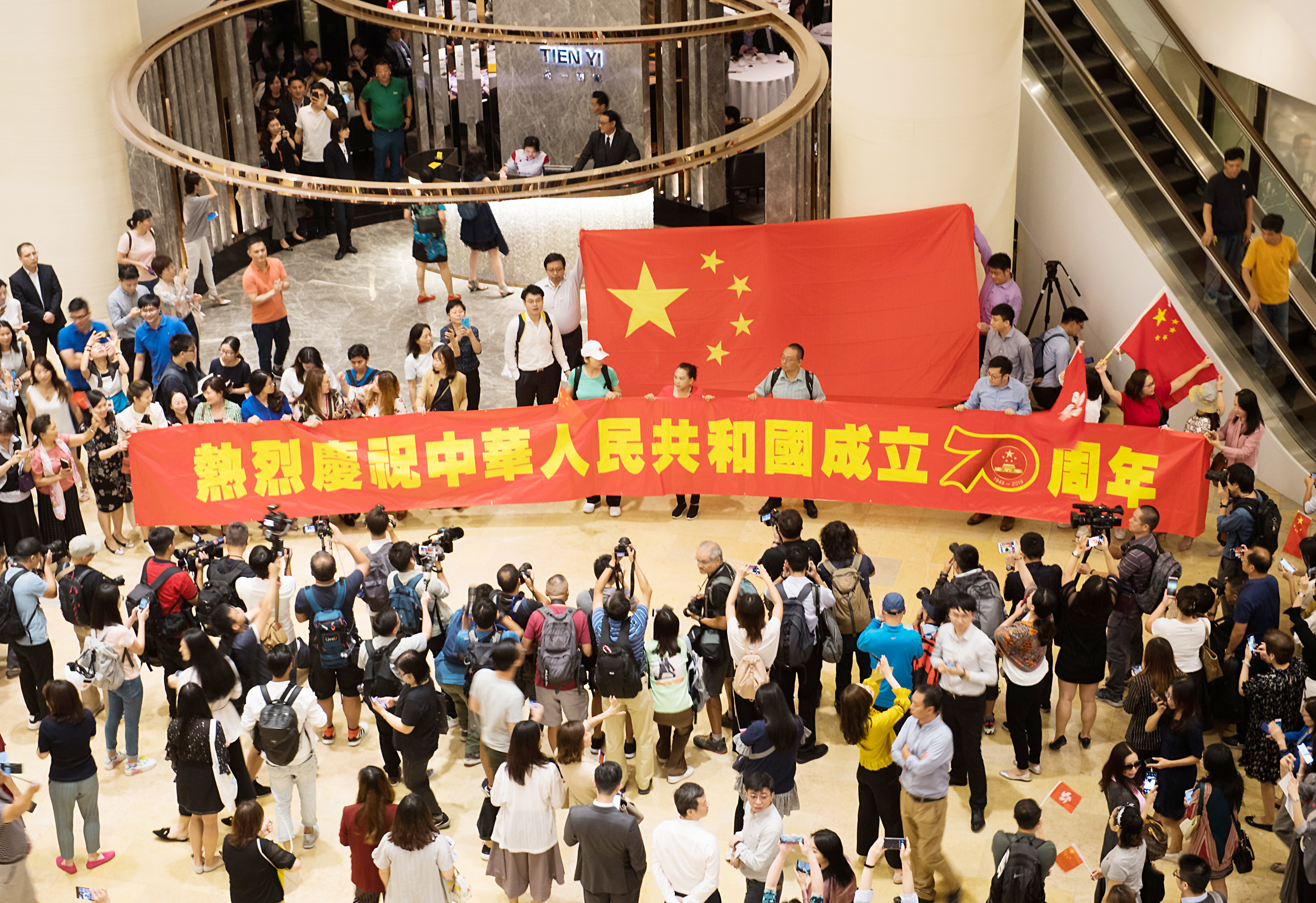 9月24日,一场爱国快闪活动在香港太古广场举行。大批香港市民高唱爱国歌曲,庆祝中华人民共和国成立70周年。