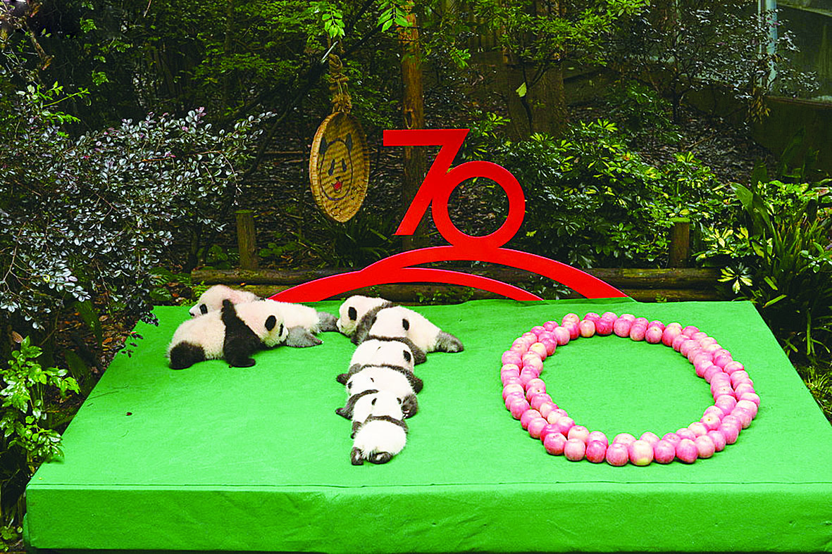 成都大熊猫繁育研究基地近日为今年出生的7只新生大熊猫举行了隆重的亮相活动,7只新生大熊猫拼出“70”图案,庆祝中华人民共和国成立70周年。 (晚报综合)
