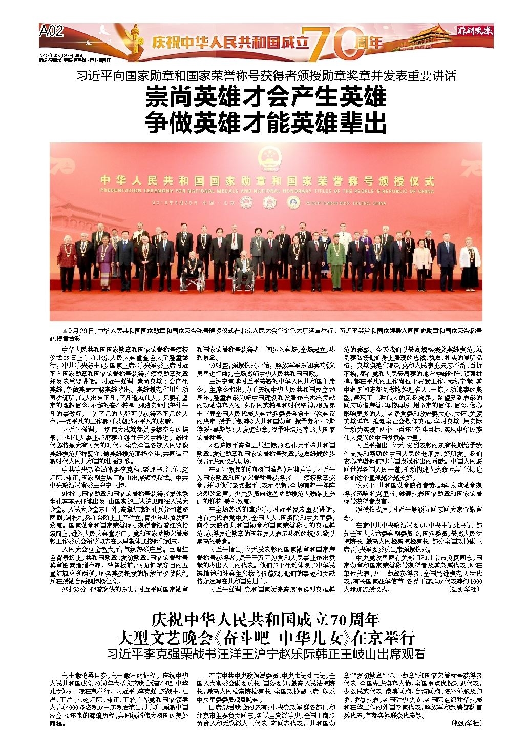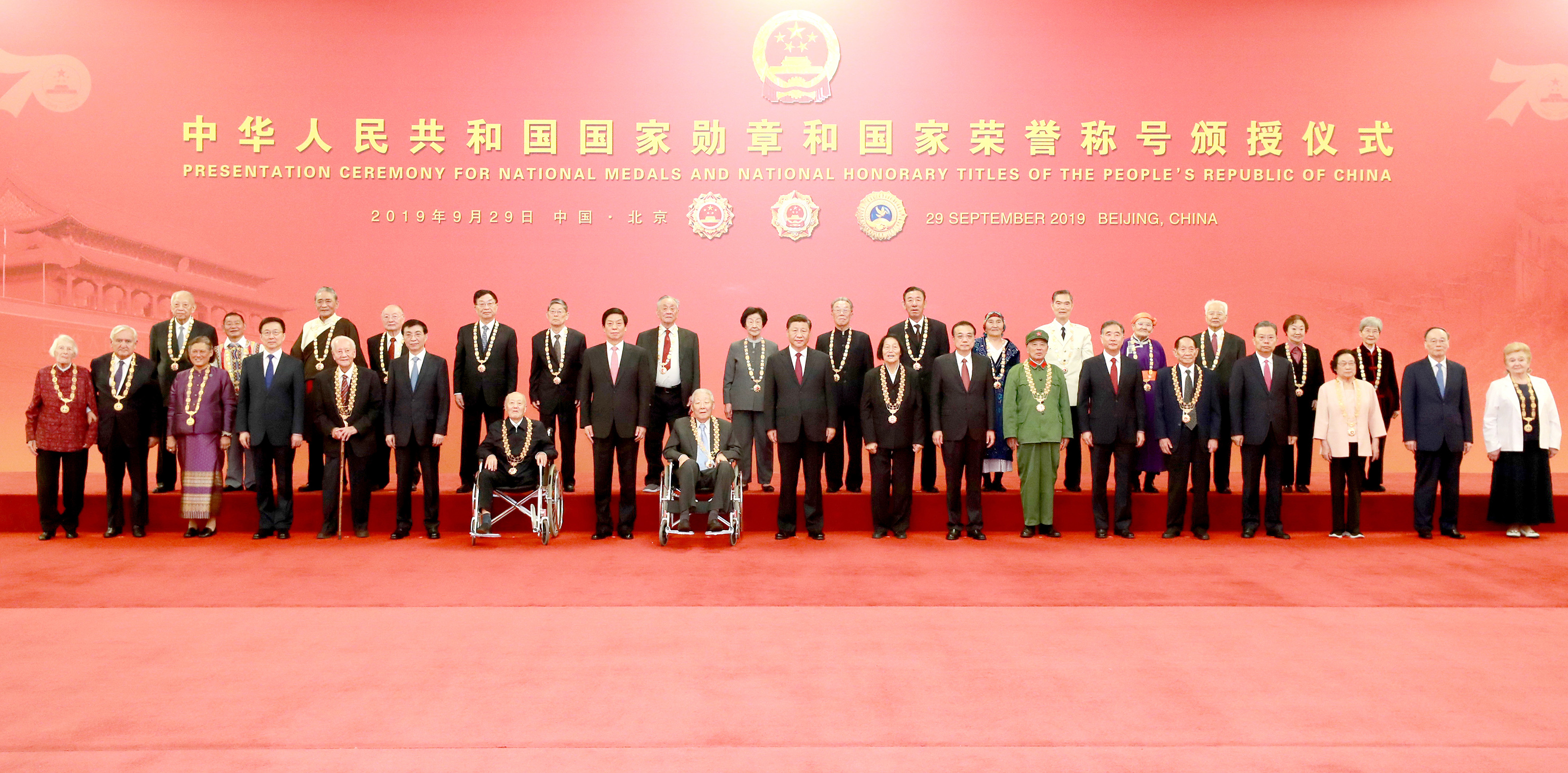 ▲9月29日,中华人民共和国国家勋章和国家荣誉称号颁授仪式在北京人民大会堂金色大厅隆重举行。习近平等党和国家领导人同国家勋章和国家荣誉称号获得者合影