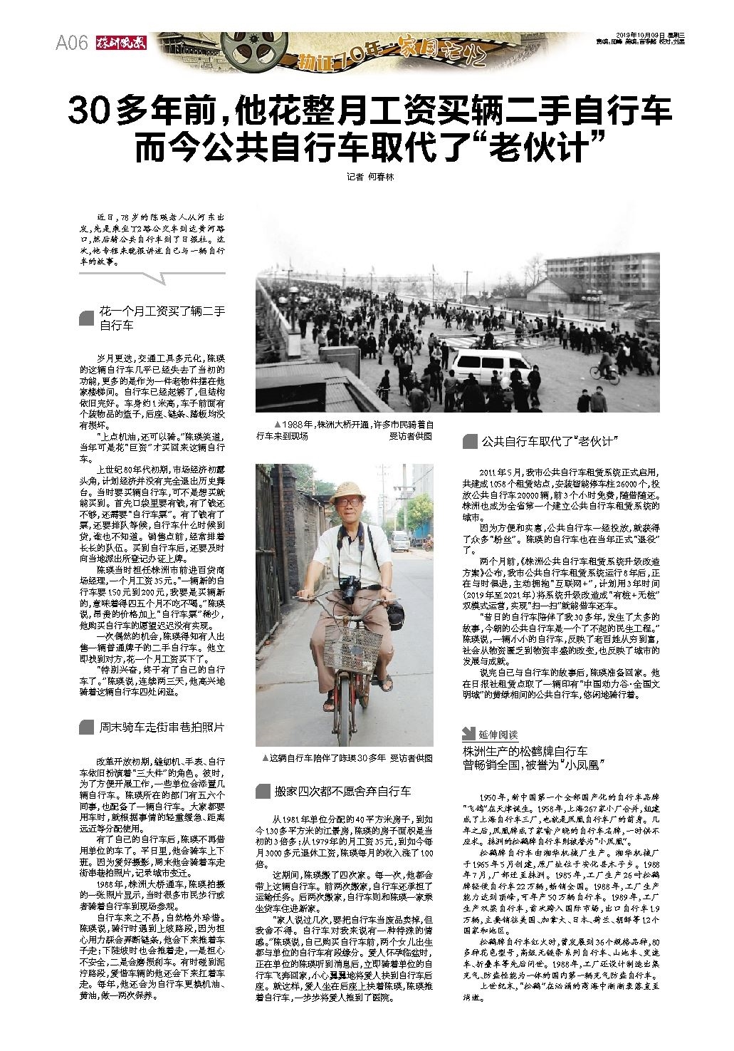30多年前,他花整月工资买辆二手自行车 而今公共自行车取代了“老伙计”