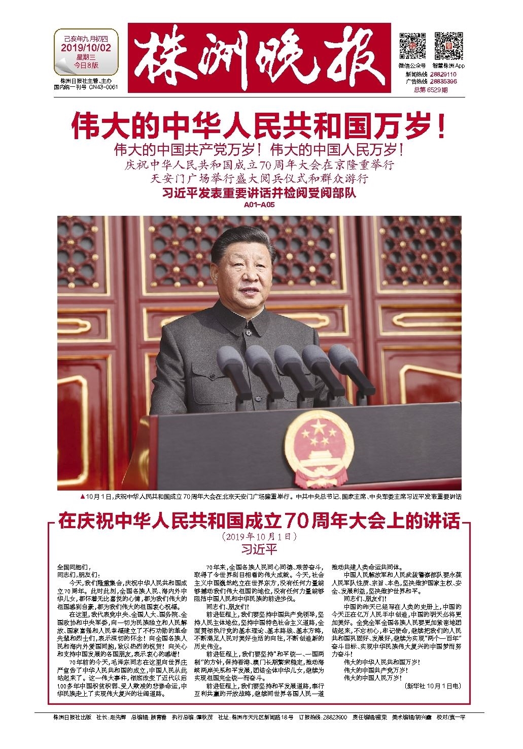 ▲10月1日,庆祝中华人民共和国成立70周年大会在北京天安门广场隆重举行。中共中央总书记、国家主席、中央军委主席习近平发表重要讲话