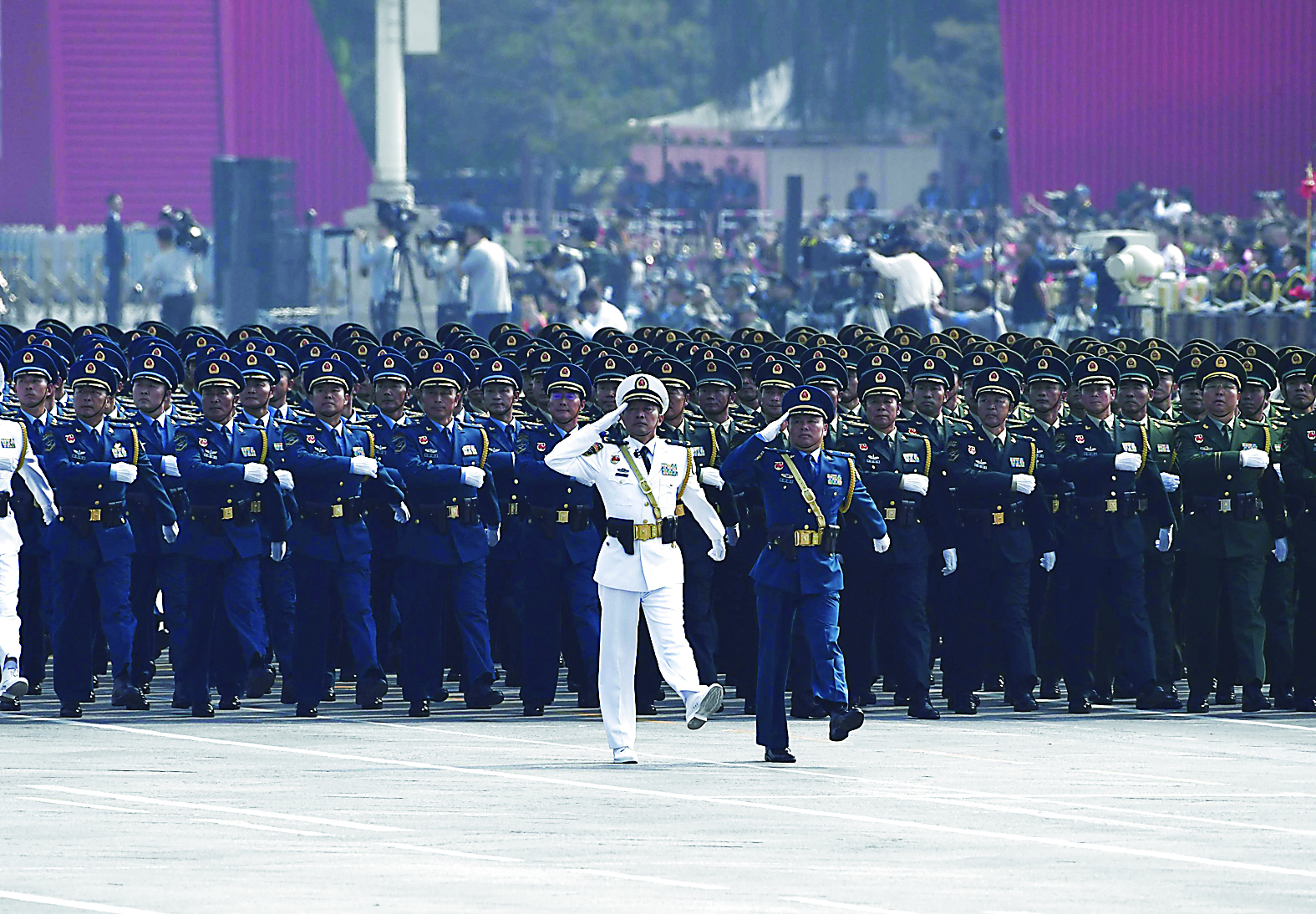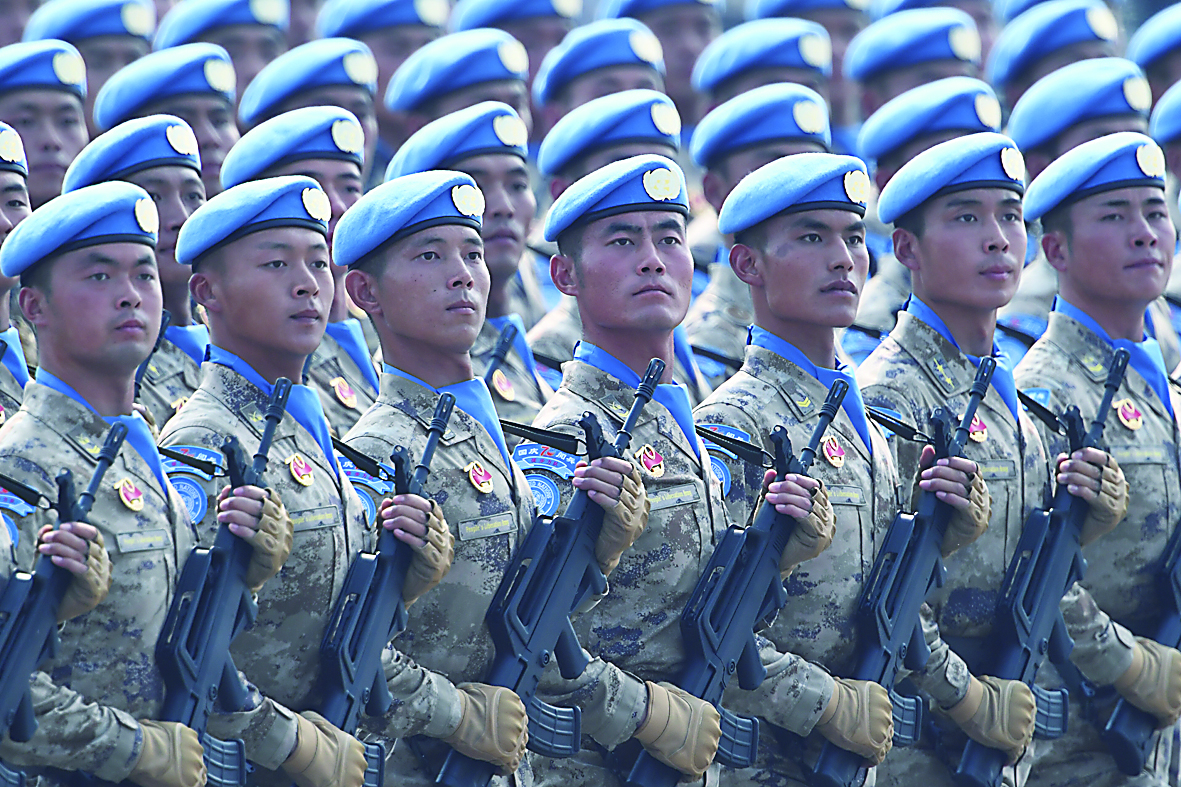 头戴蓝色贝雷帽、胸佩蓝色丝巾的维和部队方队,作为最后一支徒步方队经过天安门,首次在国庆阅兵中接受检阅。
