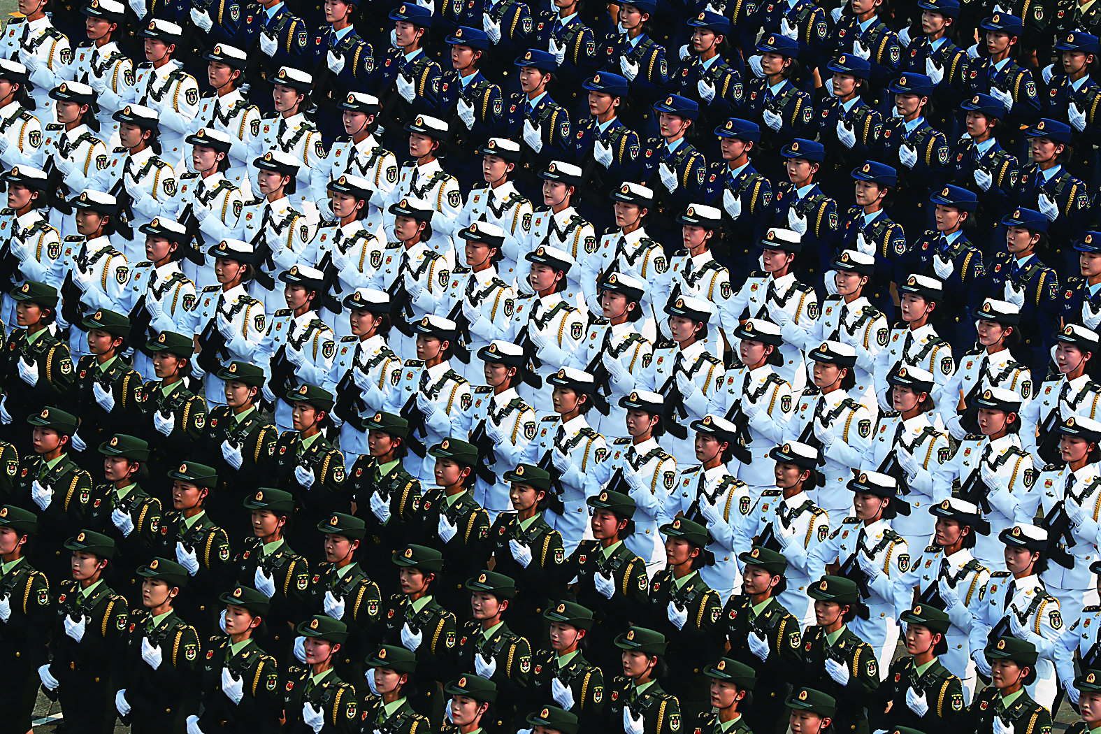 松枝绿、浪花白、天空蓝、藏青黄、橄榄绿,女兵方队首次以挂枪形式,全新混合编组参加国庆阅兵。这也是武警部队女兵首次参加国庆阅兵。