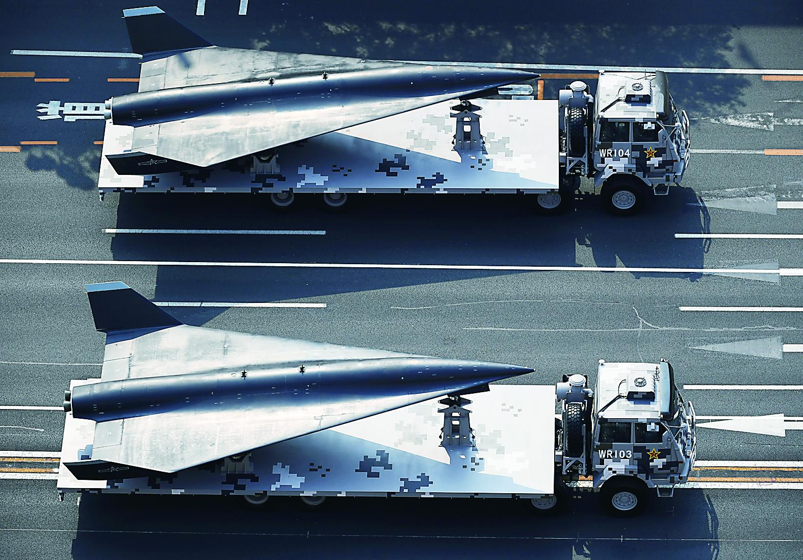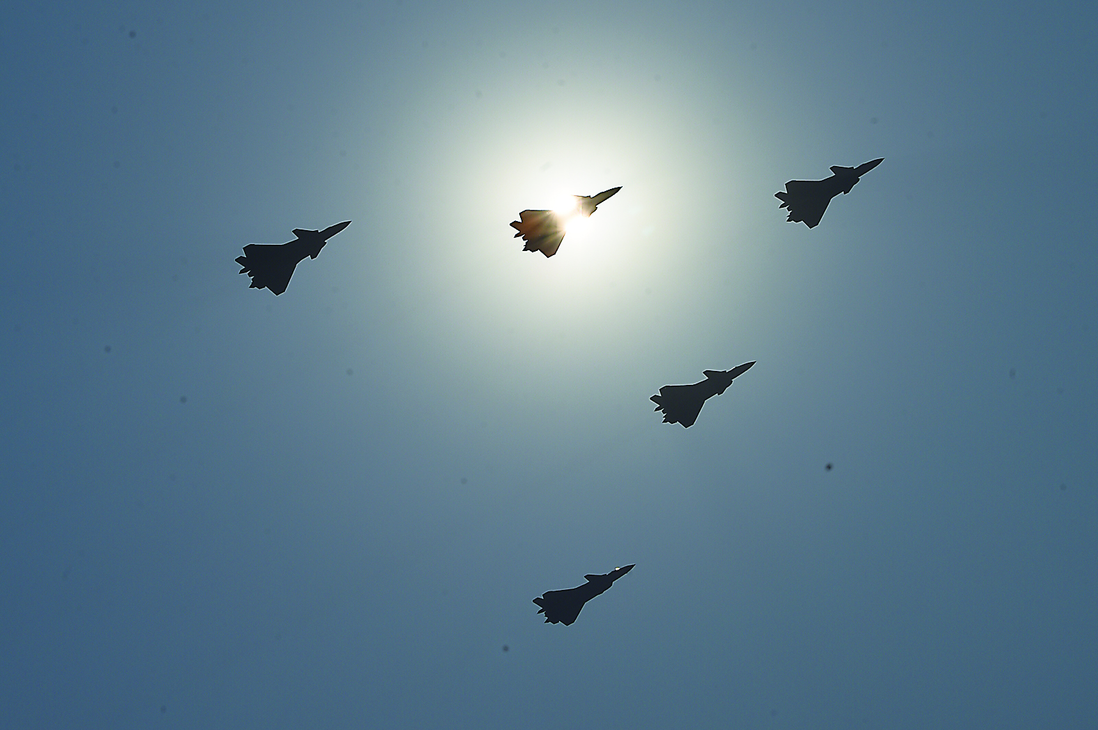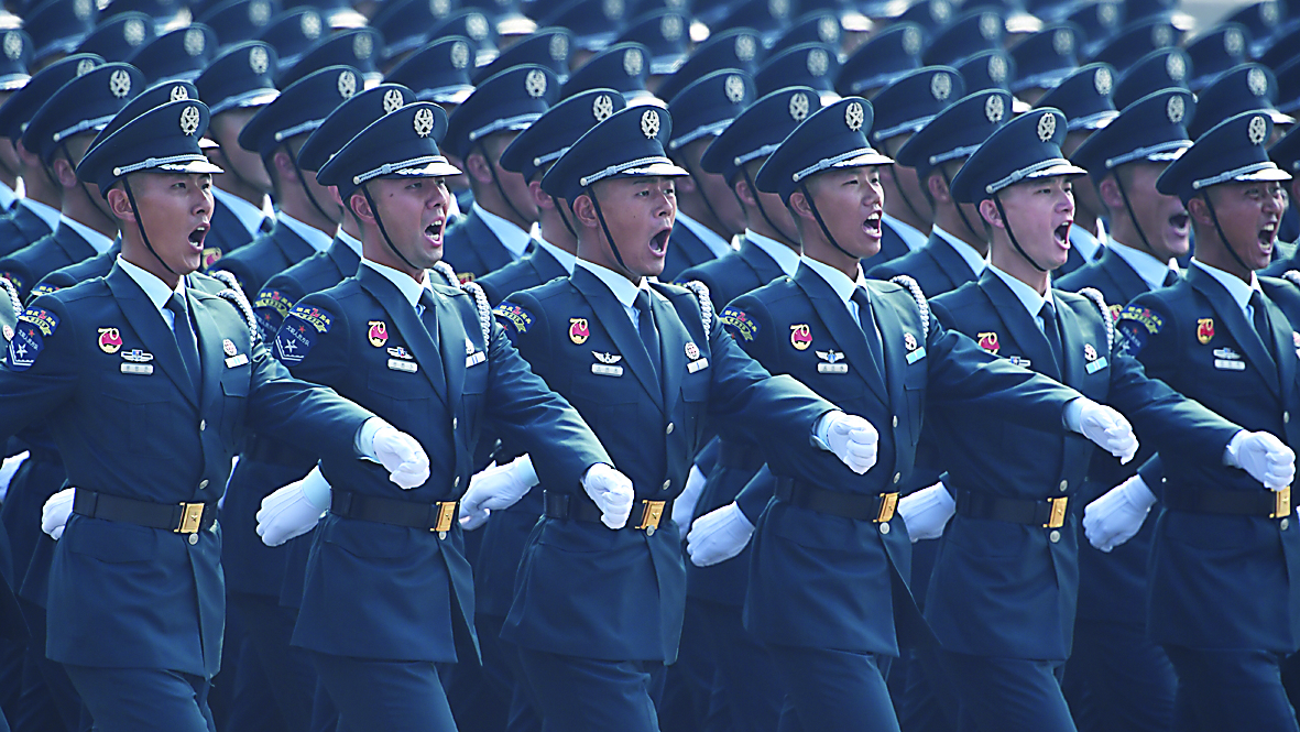 由5架歼-20、5架歼-16和5架歼-10C飞机组成的歼击机梯队呼啸着飞过天安门广场上空。