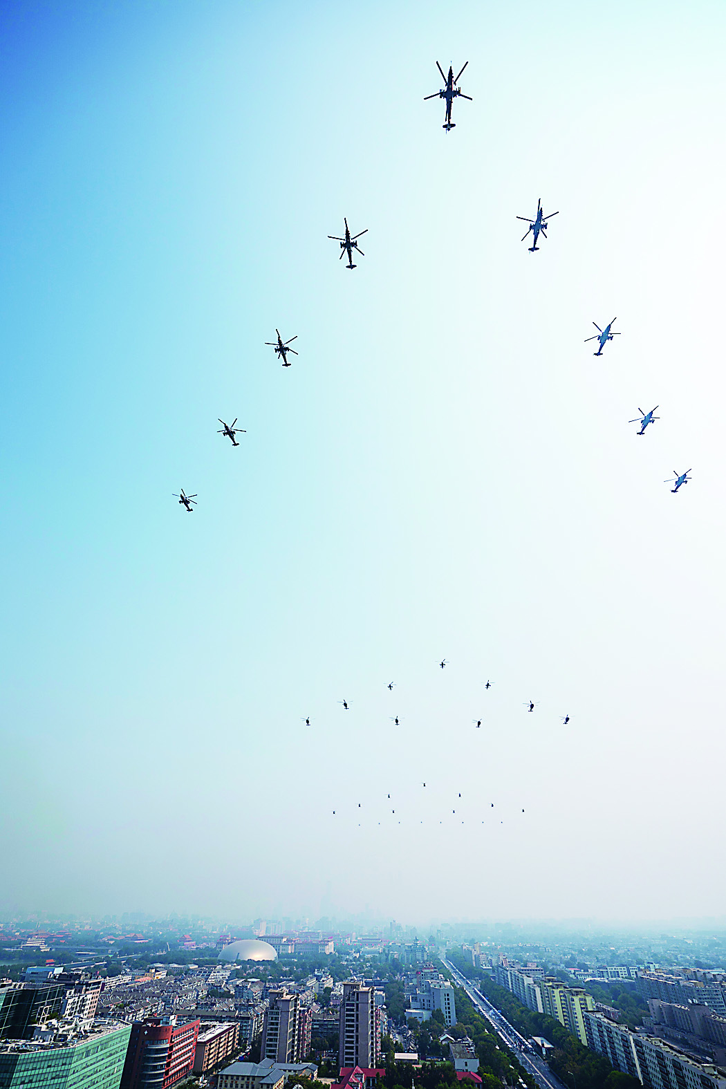 伴随着巨大的轰鸣声,涵盖陆军航空兵现役所有主战装备的陆航突击梯队1日掠过天安门广场上空,刚刚列装部队的直-20直升机首次公开亮相。