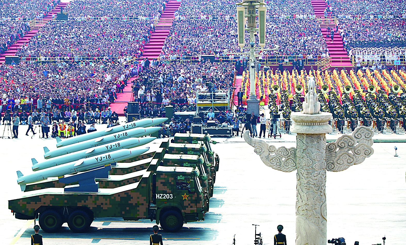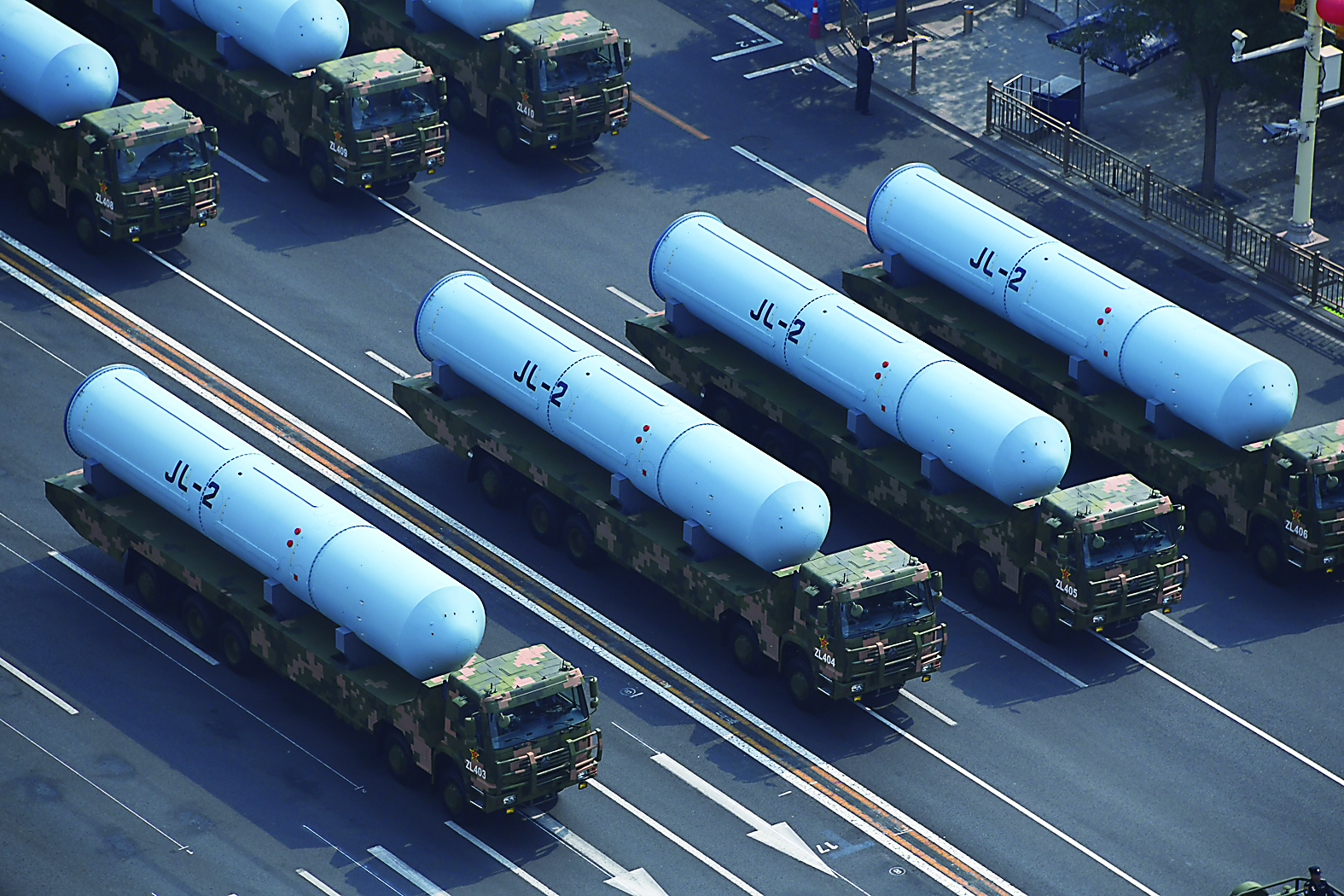 由12辆受阅导弹车组成的巨浪-2导弹方队,1日上午威严列阵、气势如虹地通过天安门。