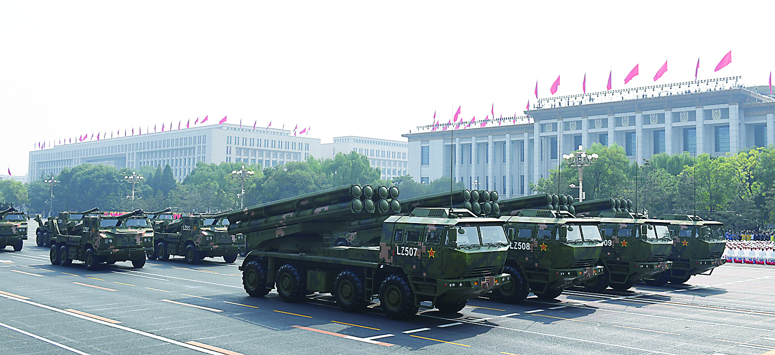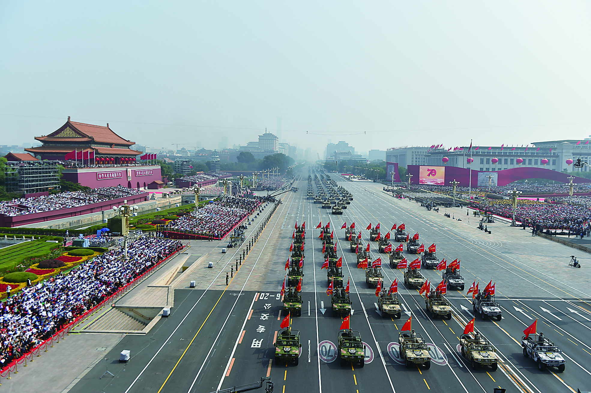在五大战区指挥员引领下,载着100面荣誉战旗的猛士车缓缓驶过天安门。