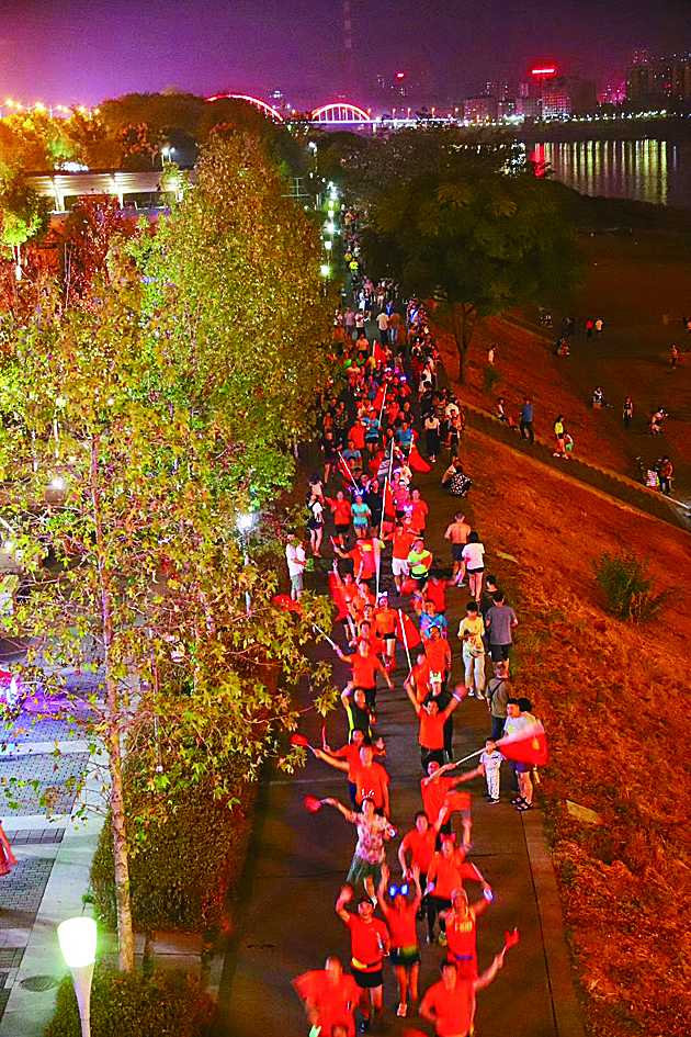 10月1日晚,我市400多名长跑爱好者相聚河西湘江风光带,用长跑健身的方式,共庆新中国成立70周年。