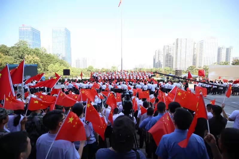 “我和我的祖国,一刻也不能分割;不论我走到哪里,都流出一首赞歌……”1000余名干部挥舞手中的国旗,齐声高唱《我和我的祖国》和《动力谷之歌》。