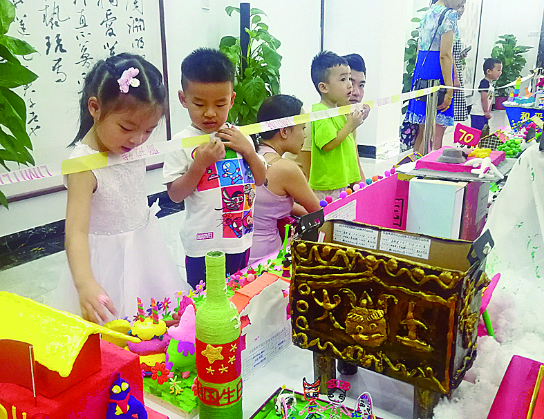 用红豆、玉米粒做成的天安门城楼、用彩泥捏成的56个民族人物、用纸盒做成的万里长城……这些创意满满又栩栩如生的作品,大多出自我市幼儿园小朋友之手。国庆期间,不少市民来到市文化园文化馆,欣赏株洲市首届幼儿美术展。