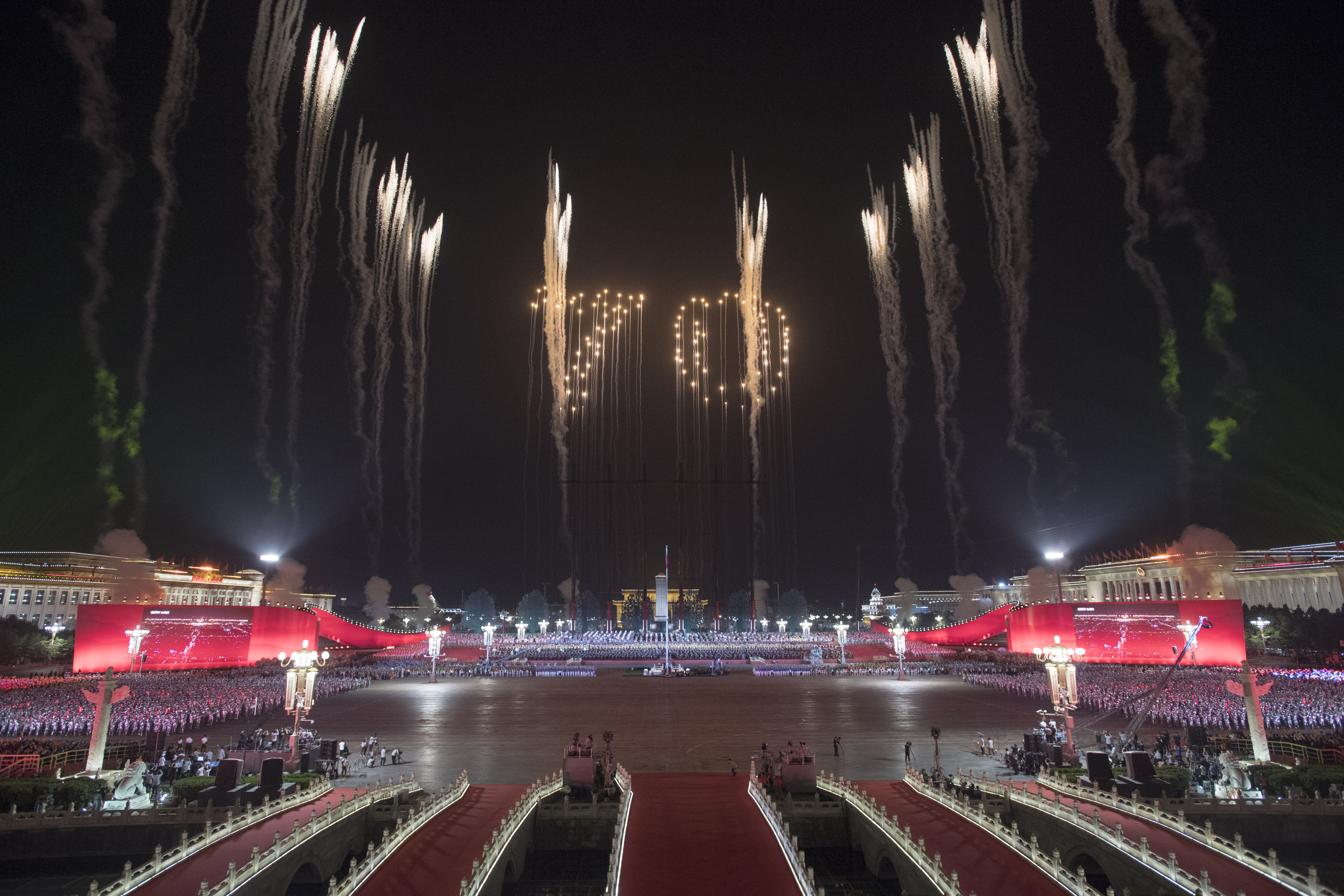 高难度特效焰火“人民万岁”压轴登场,三次连续绽放,配以手持烟花、音乐烟花和各种新型礼花,使天地交相辉映,铺展出一幅欢乐祥和的盛世图景。