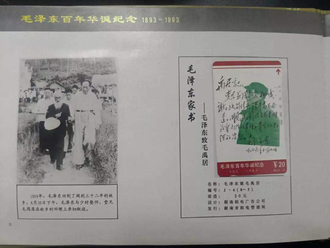 张轶强介绍,这次展出的藏品中,最珍贵的是为纪念毛泽东同志诞辰100周年,湖南邮电广告公司1993年发行的两套电话磁卡。一套为“毛泽东在湖南”,全套6张;另一套为“毛泽东家书”,全套8张。