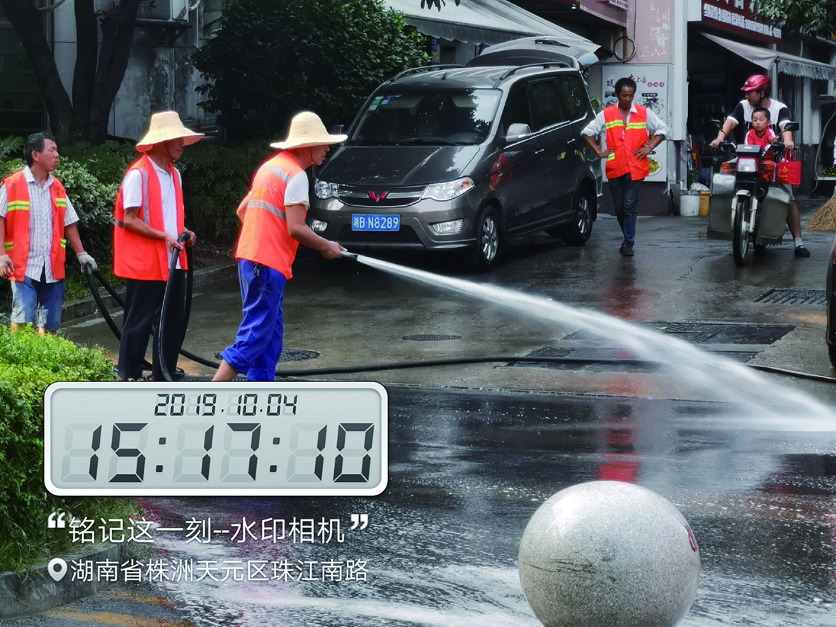 10月6日,在泰山路康桥美郡小区路段,两名环卫工正配合着冲洗路面,路面渐渐露出底色。环卫师傅告诉记者,自己从事环卫工作已经十余年了,今年是新中国成立70周年,节日气氛很浓,来株洲游玩的人也多,“在这种关键时刻,我们要为城市居民营造良好的生活环境,也要给外地游客留下美好的印象。”