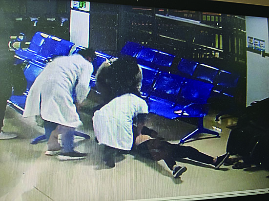 当日上午11时40分左右,省直中医院3楼皮肤科门诊的候诊大厅,一名男子突然丧失意识,一下子陷入休克状态,从椅子上摔倒在地。