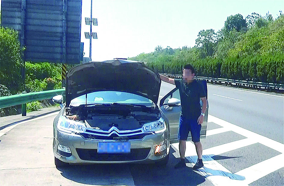 前日上午,民警驱车巡逻时,发现一辆衡阳牌照的轿车开着双闪灯,车子的引擎盖立起,正在应急车道上缓慢前行。民警赶紧鸣笛示警,将该车引至前方港湾处。
