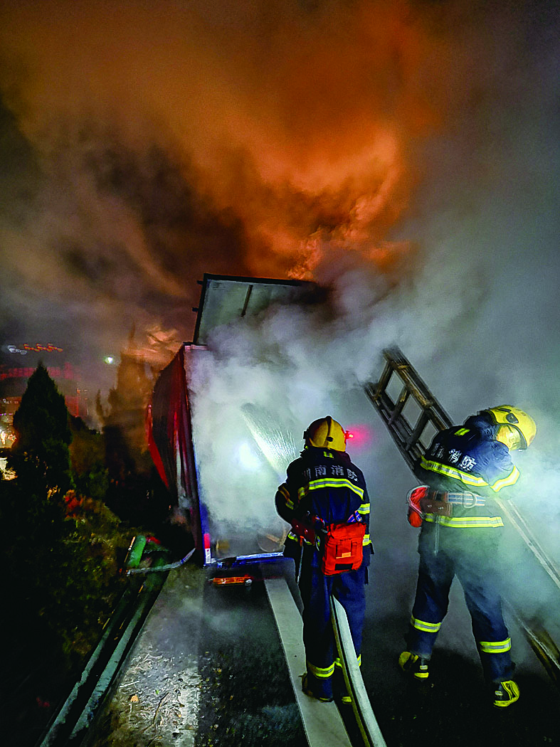 消防员立即出动水枪扑救,火势在半个小时内被扑灭。随后,吊车对货车实施起吊,现场交通恢复畅通。