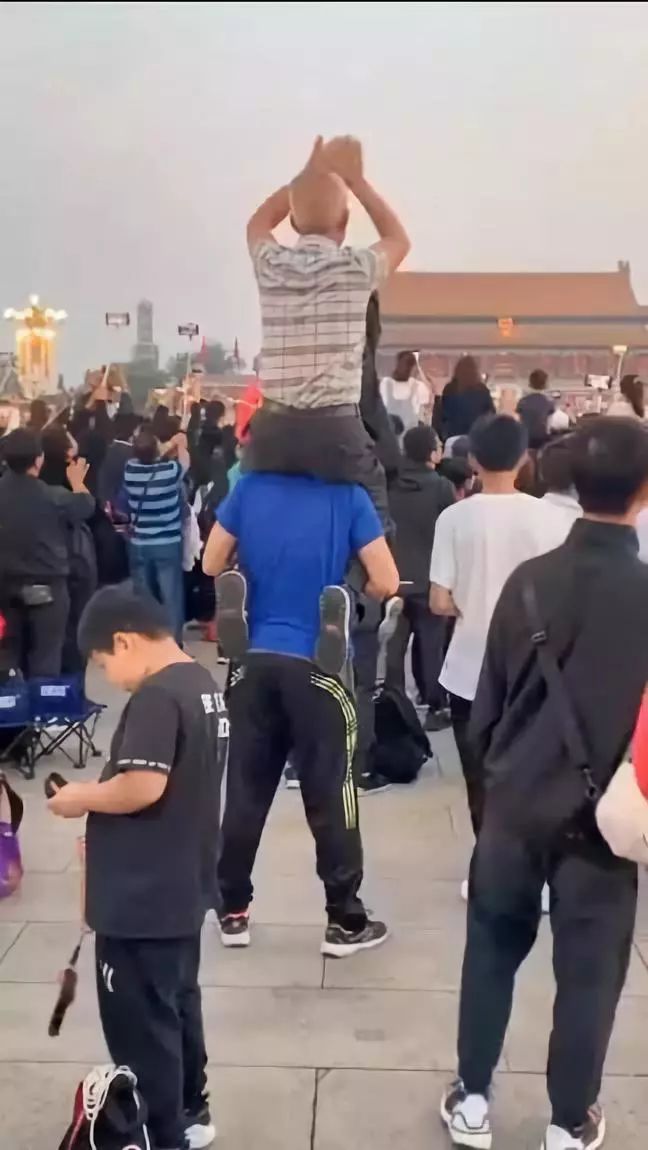 10月3日清晨,于雷将父亲架在肩头,站在天安门前观看升国旗。父亲激动得一边拍手一边跟着唱国歌,于雷则稳稳地扶住父亲的双腿。这一幕被现场游客拍下,并发到网上感动了无数网友。