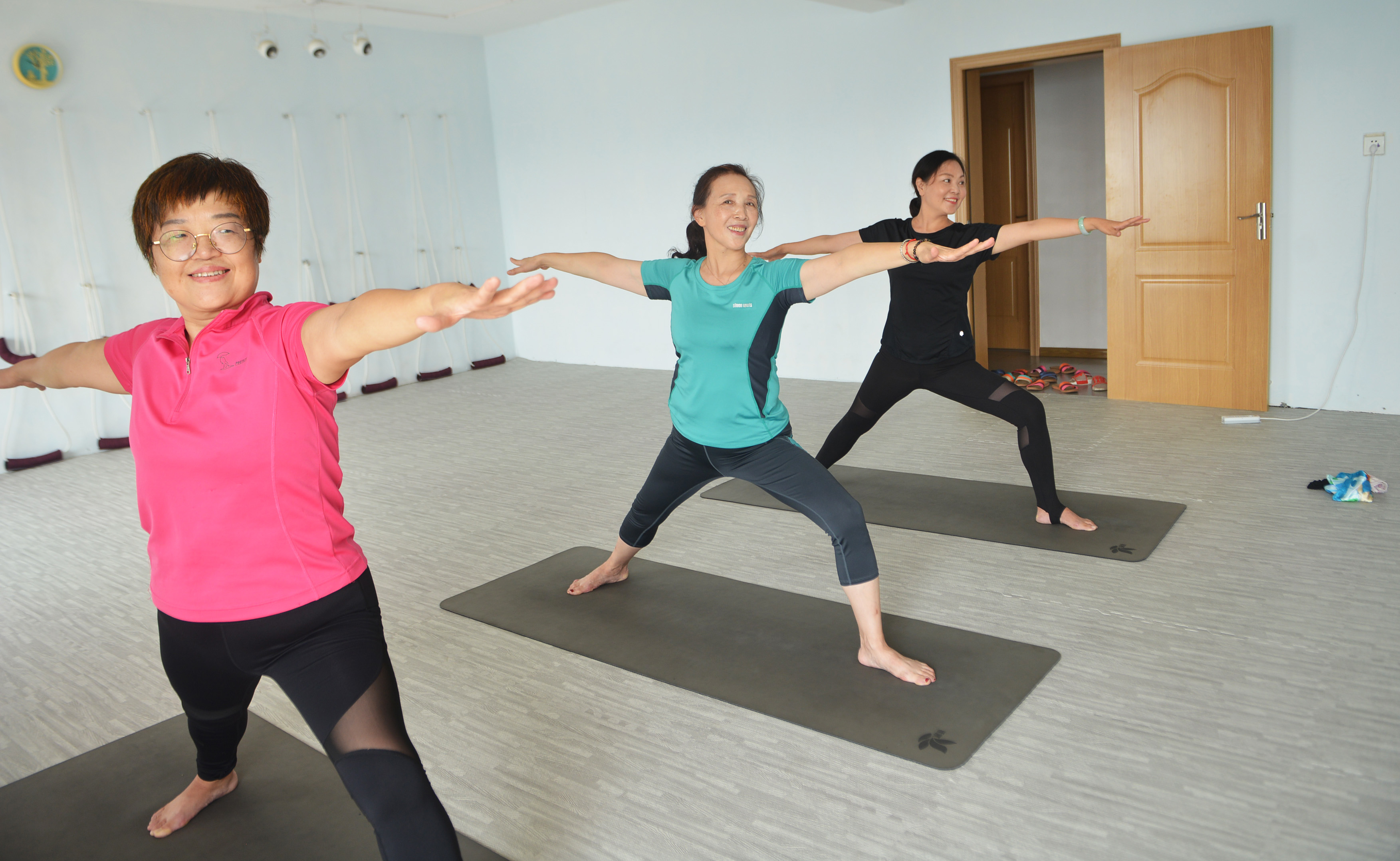 ▲60岁的罗阿姨(中)和闺蜜们在一起练瑜伽
