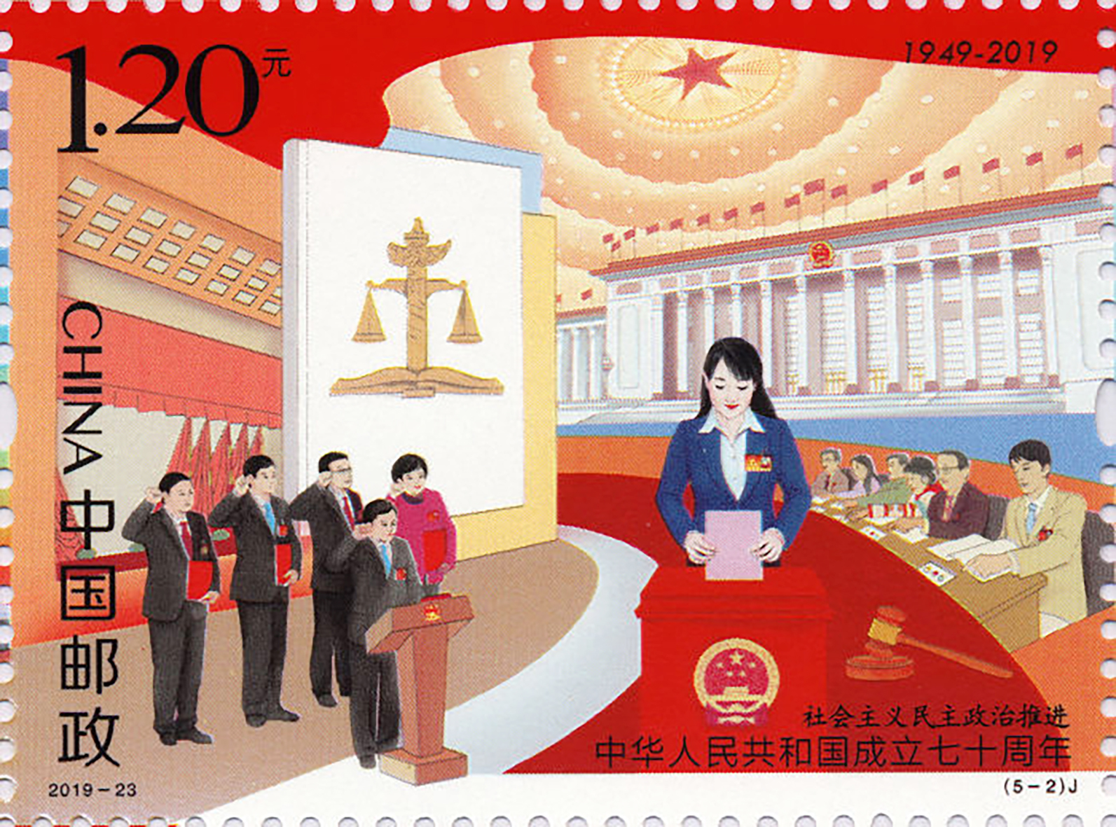 邮票第一图画面运用城市建设、高铁、航空航天、通信和互联网、智能装备制造等元素,配以劳动者的形象,表现了“经济持续健康发展”的主题;第二图画面运用人民大会堂、法律文本等元素,配以人大代表、政协委员等形象,表现推进社会主义民主政治制度化、规范化、程序化,体现了“社会主义民主政治推进”的内涵;第三图画面以国家博物馆、国家大剧院、国家体育场等公共文化设施,配以舞蹈演员、运动员等形象,展现“文化繁荣兴盛”的概念;第四图画面运用代表教育、医疗、社会保障的元素,配以少年儿童等形象,表现人民的获得感、幸福感、安全感更加充实、更有保障、更可持续,突出“人民生活不断改善”的主题;第五图画面内容为青山绿水、一望无垠的广袤森林等元素,配以植树的母子形象,表现了宁静、和谐、美丽的自然环境,烘托了“建设美丽中国”的主题。小型张邮票图案为衬以牡丹花图案的数字“70”以及扬帆起航的巨轮,边饰图案则以各族人民载歌载舞的欢庆画面,表现“祝福祖国”70华诞的寓意。