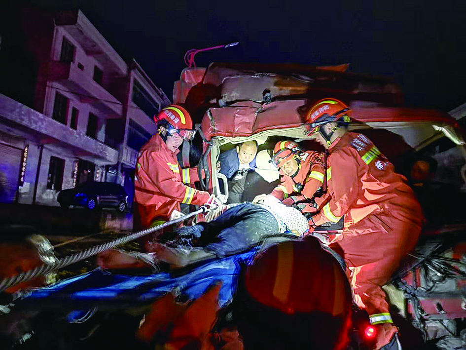 前日凌晨,攸县渌田镇境内,一辆湖北牌照的货车追尾一辆江西牌照的货车,驾驶室严重变形,3名司乘人员被困车内,还受了伤。随后,当地消防部门通过破拆将伤者救出,他们随后被送往附近医院治疗。