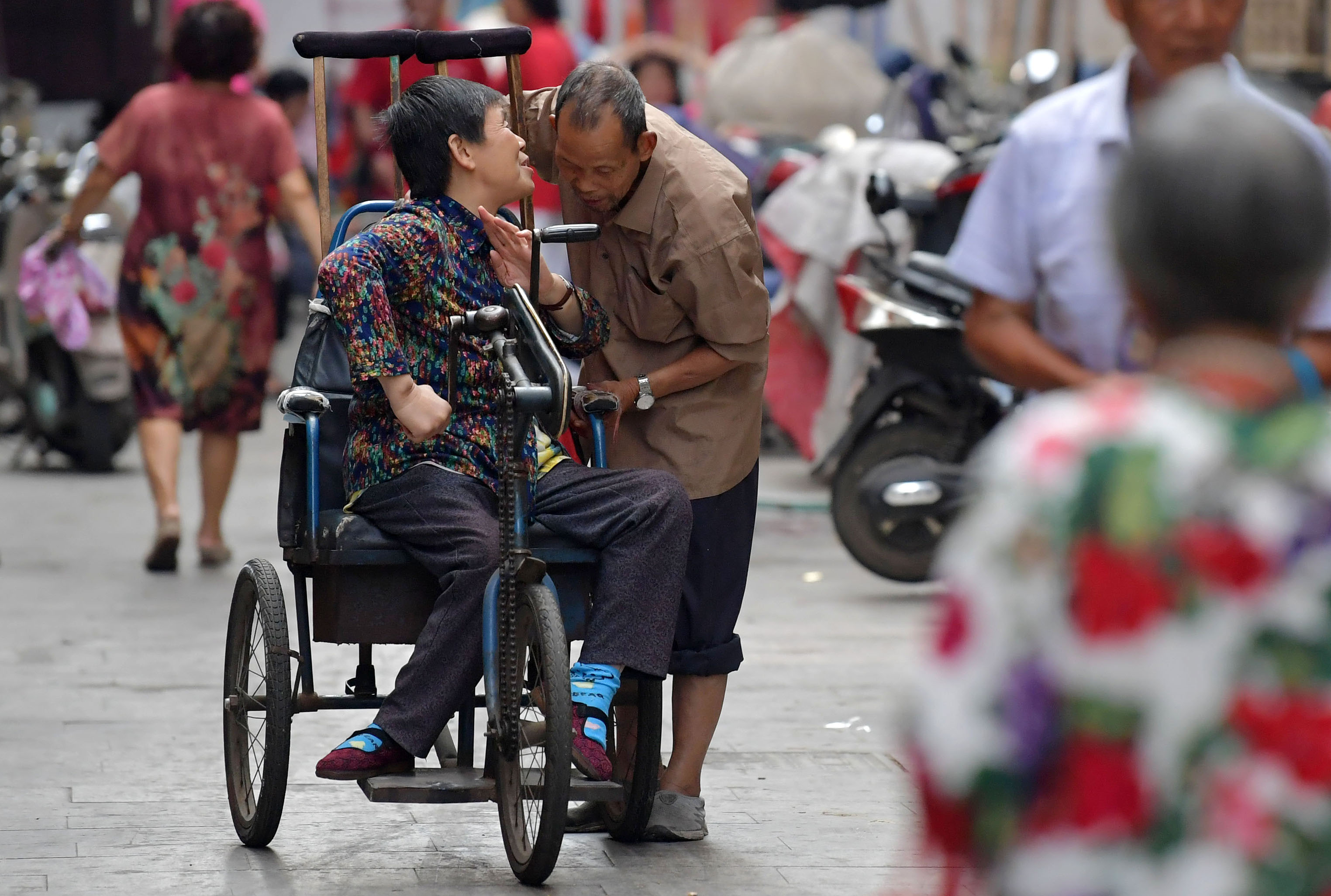 你是我的腿,我当你的耳。江西省南昌市西湖区绳金塔社区有一对特殊的夫妻,今年74岁的丈夫熊金根听力残疾,今年67岁的妻子叶文娟患小儿麻痹症行动不便。37年前,他们二人经朋友介绍相识,此后恋爱、结婚,开始了相濡以沫的夫妻生活。