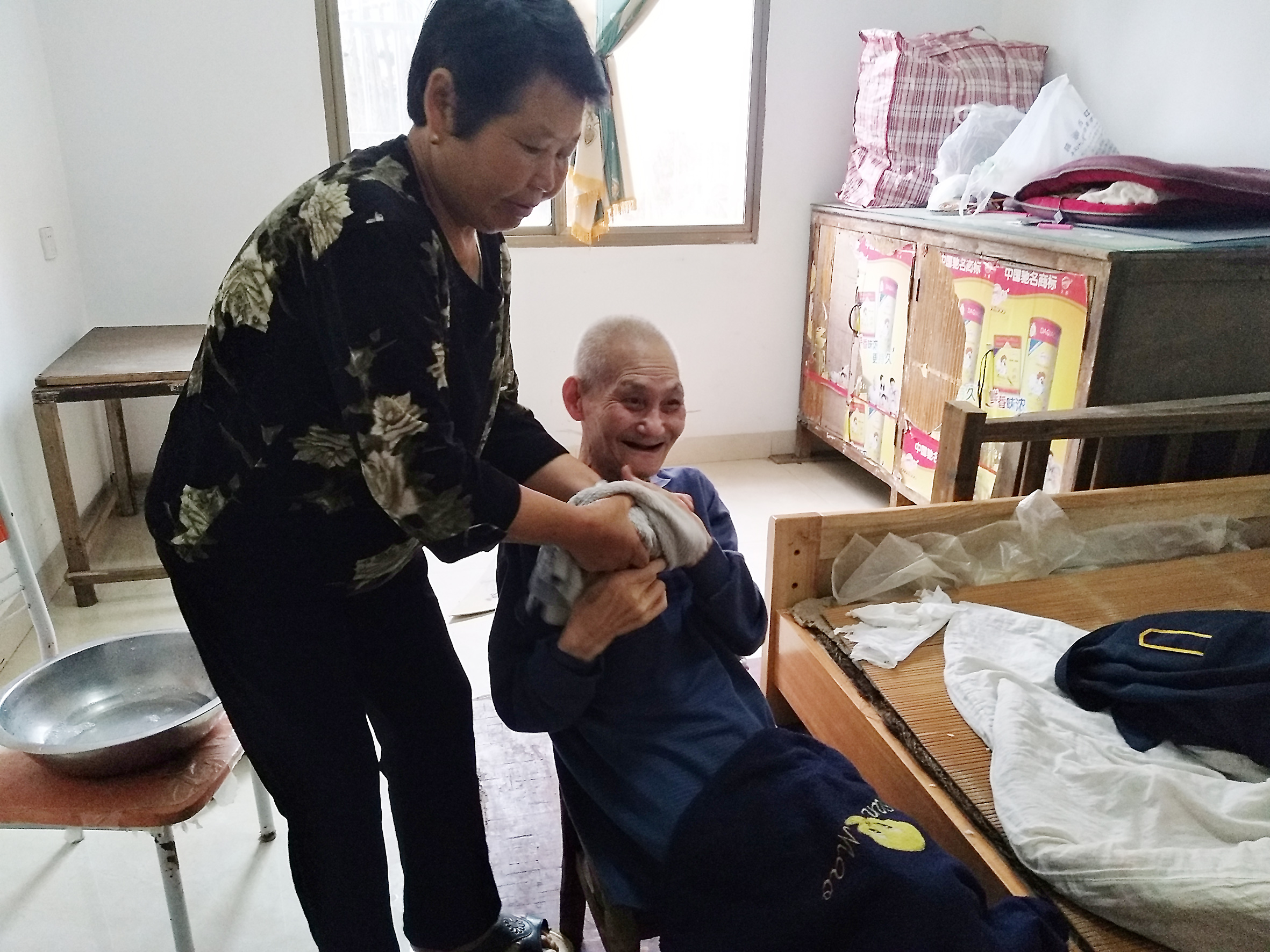 这个大家庭里,还有一个双下肢瘫痪、生活完全不能自理的何运金,他是龙照林的夫兄。何运金不能站立,要想活动只能靠挪动一张小板凳。虽然,兄弟姐妹有三个,但何运金只愿跟弟弟何运宁一家生活。龙照林便自然而然地担当起了家庭“护理员”。