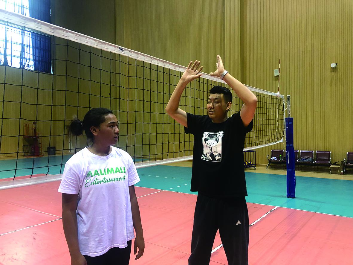 ▲李振华(右)指导汤加运动员进行排球训练 受访者供图