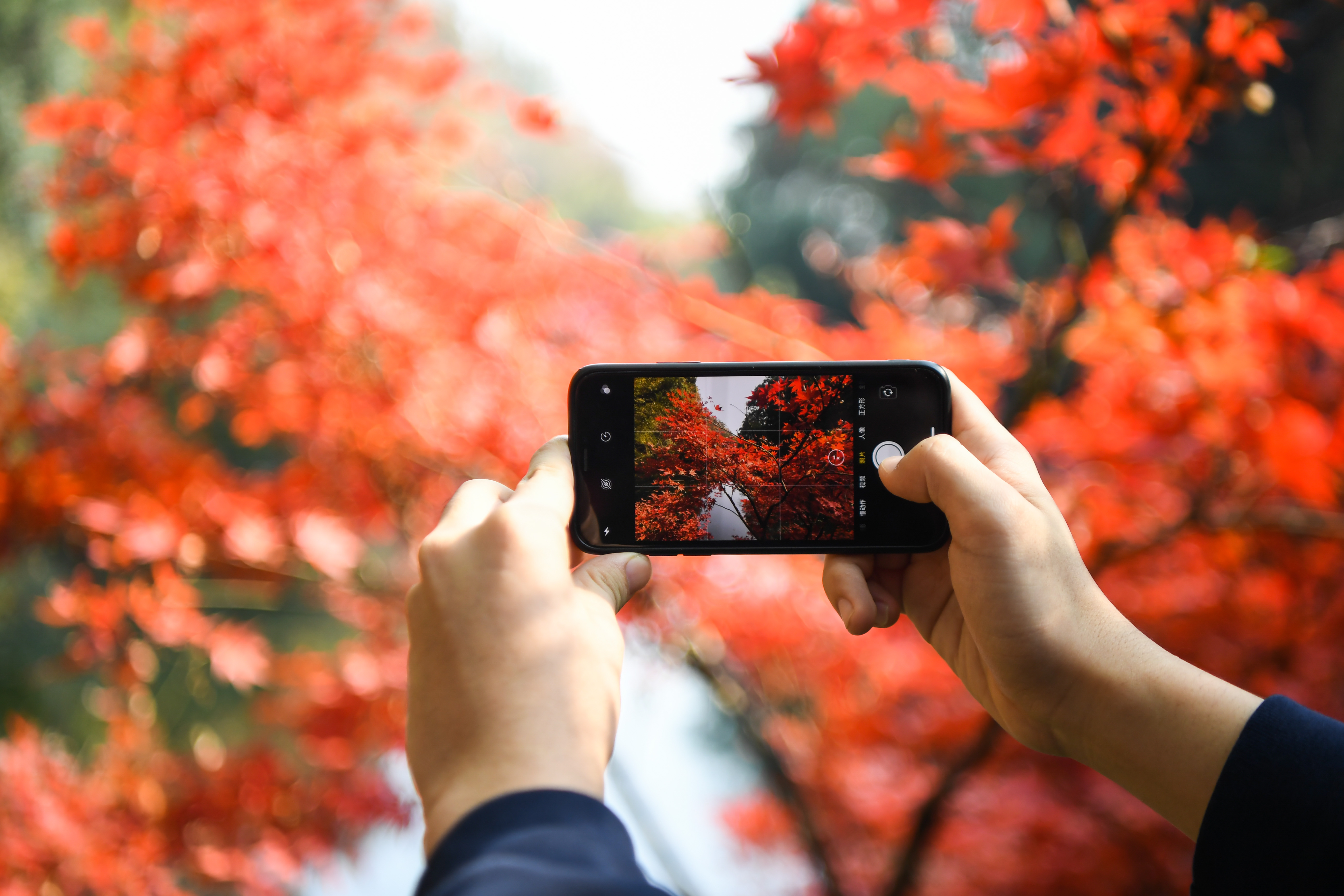 12月7日,游客在湖南长沙岳麓山用手机拍摄枫叶。